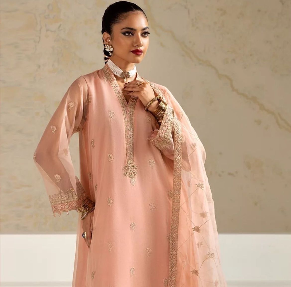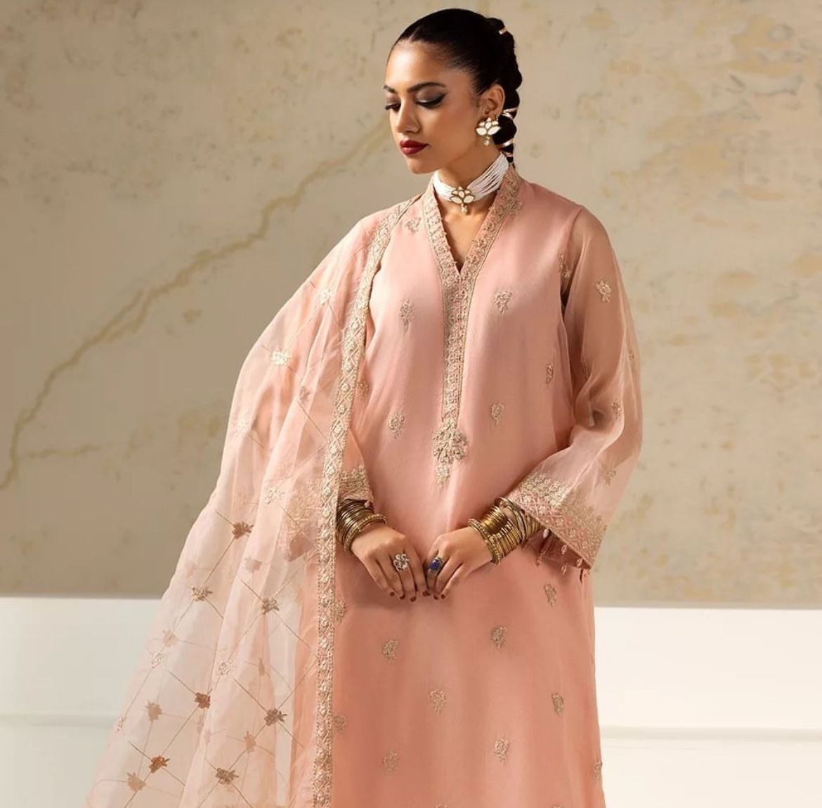 Organza Shirt with embroidered neckline, embroidered neck motifs, embroidered front jall, embroidered sleeves and embroidered daman\flare lace.