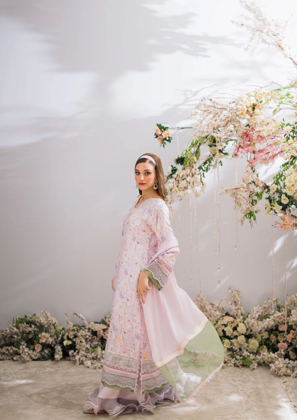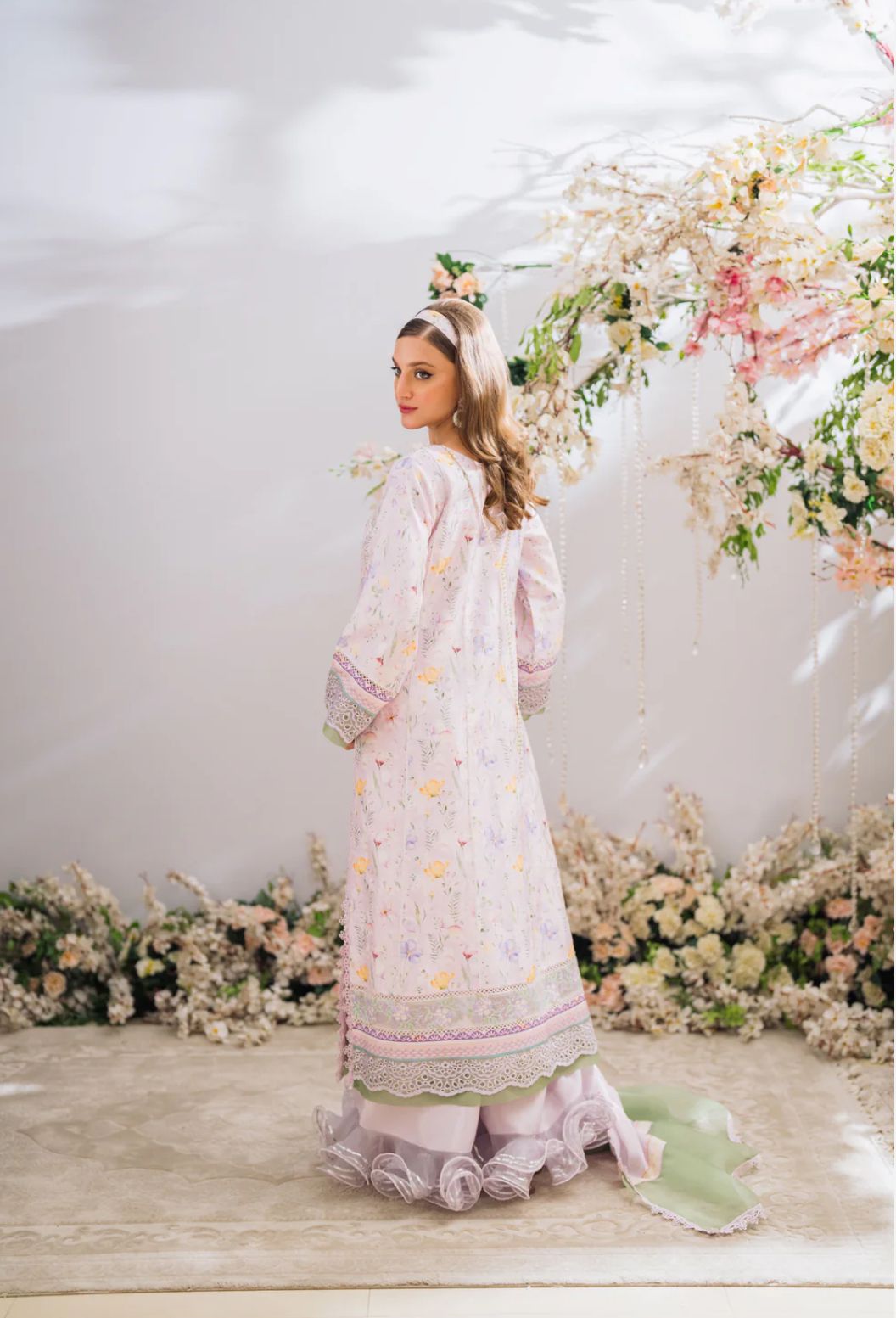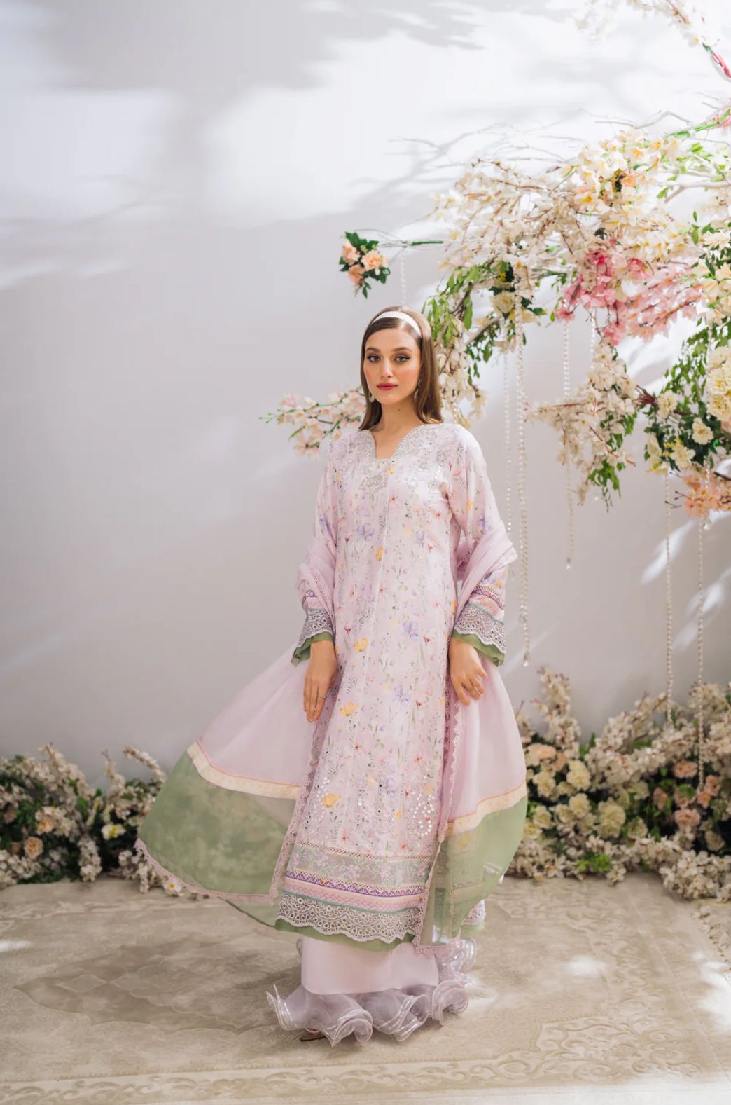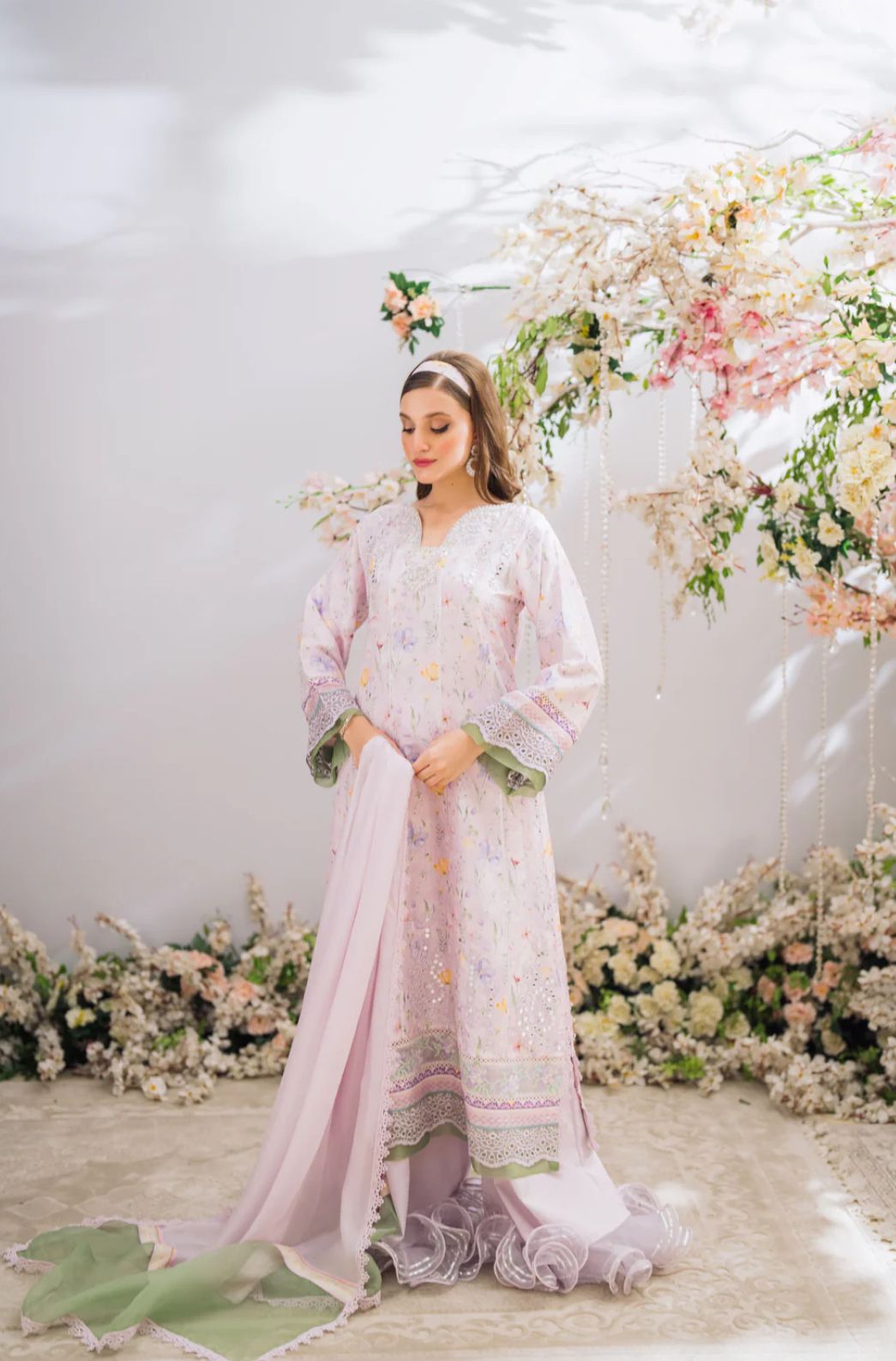 A gorgeous A-line silhouette in the perfect shade of lilac with contrasting organza details, layered with a schiffli border, popping mirror work and cross-stitch embroidered borders. Alongside it is a silk dupatta with contrasting organza pallu, and to complete the look is Raw Silk ruffled Plazos.