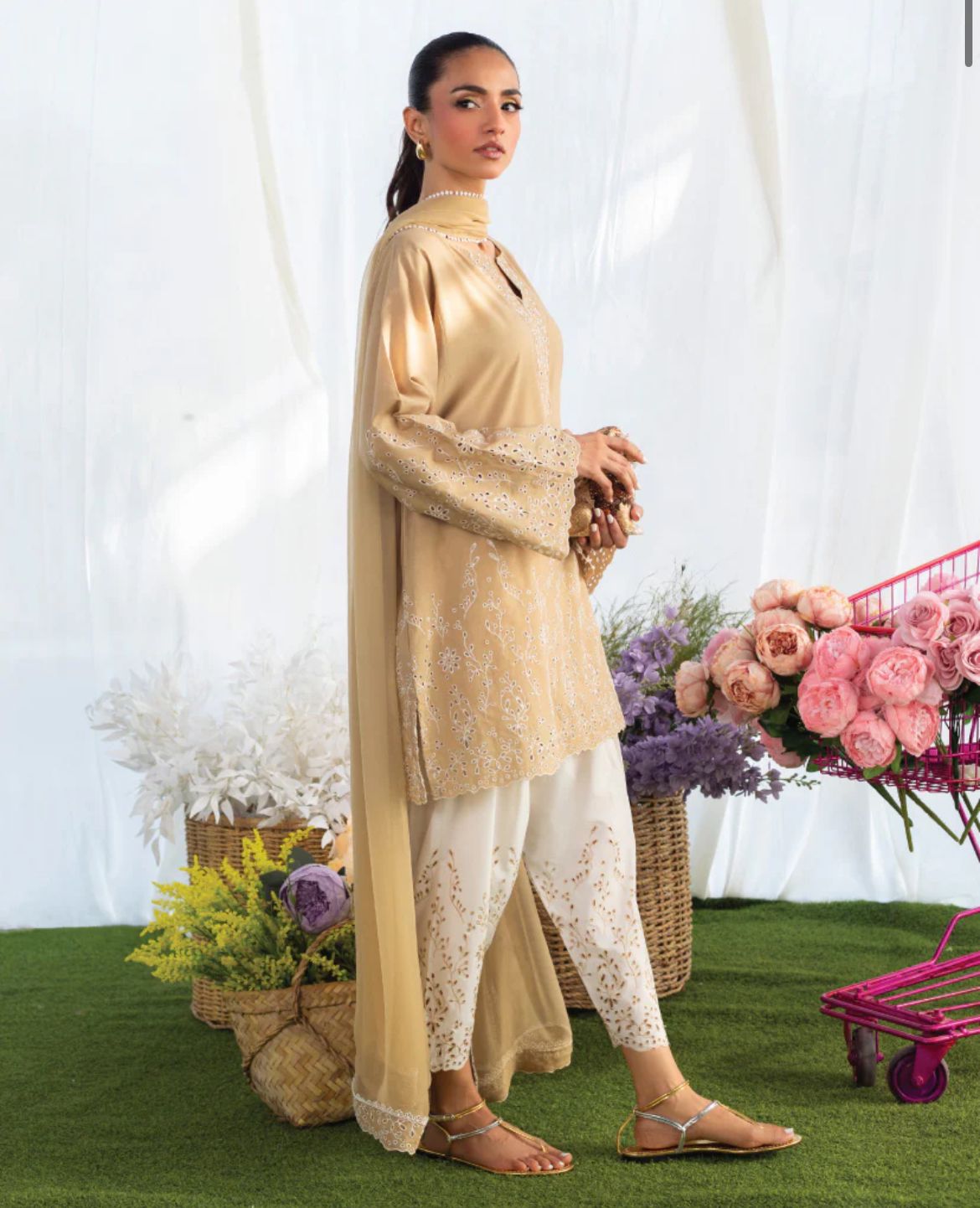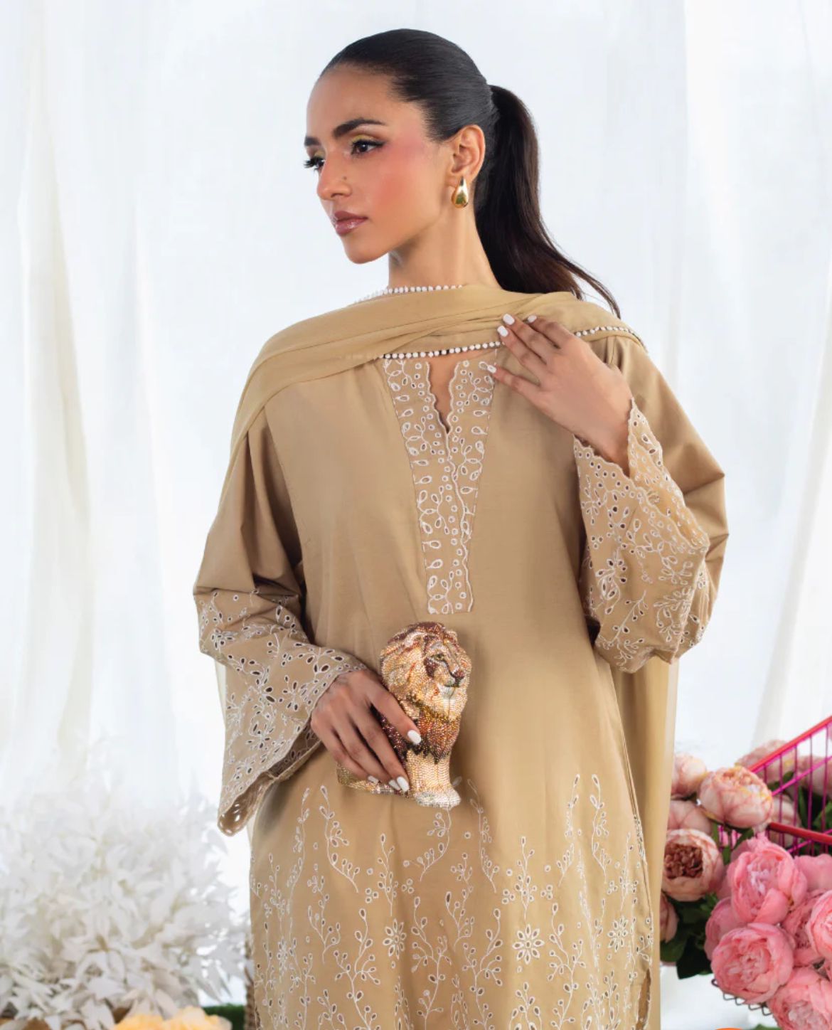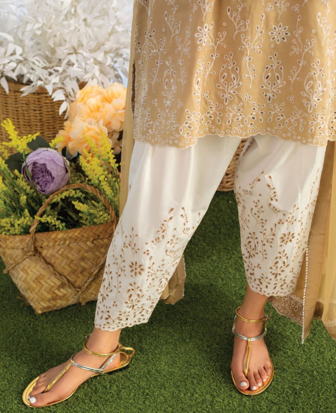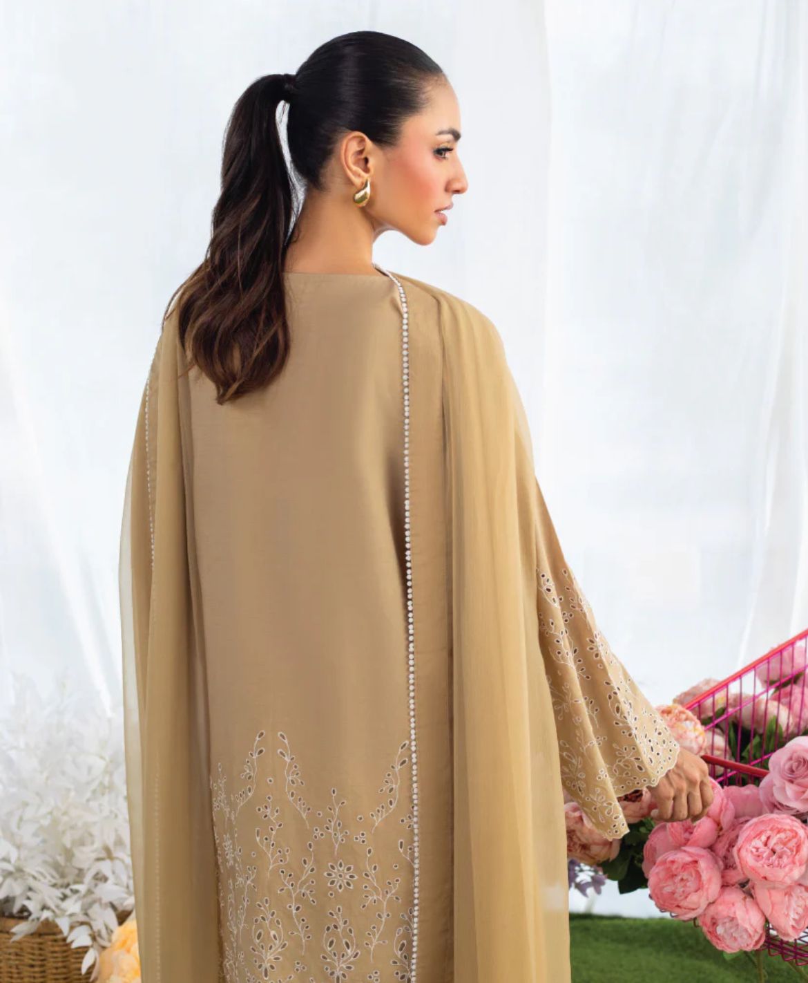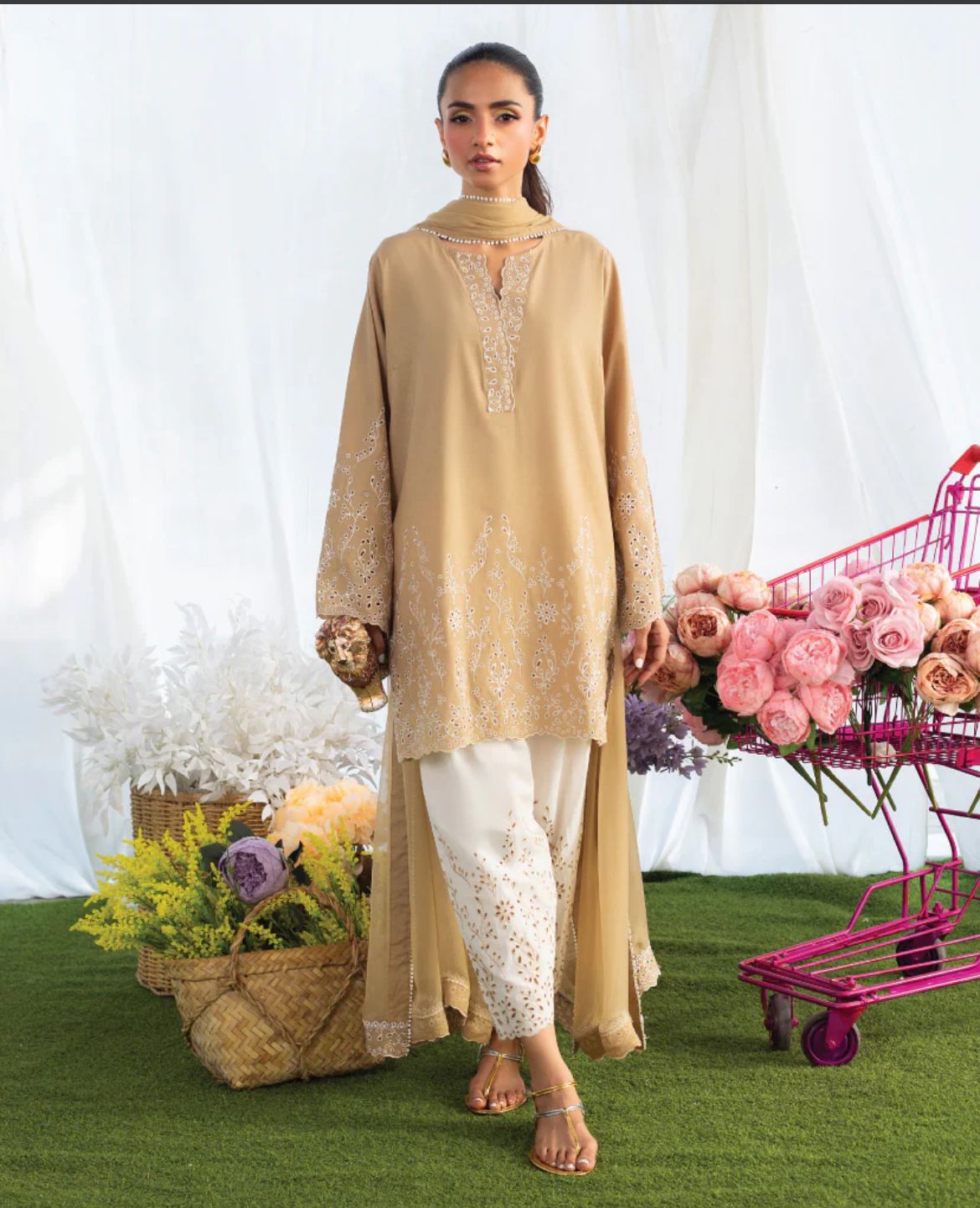 The Coco Beige set is the perfect set for this summer. The kameez and shalwar are adorned with intricate schiffli embroidery. The dupatta is premium chiffon adorned with white laces and schiffli border. The set can be purchased with and without dupatta.