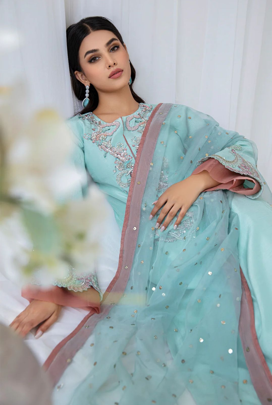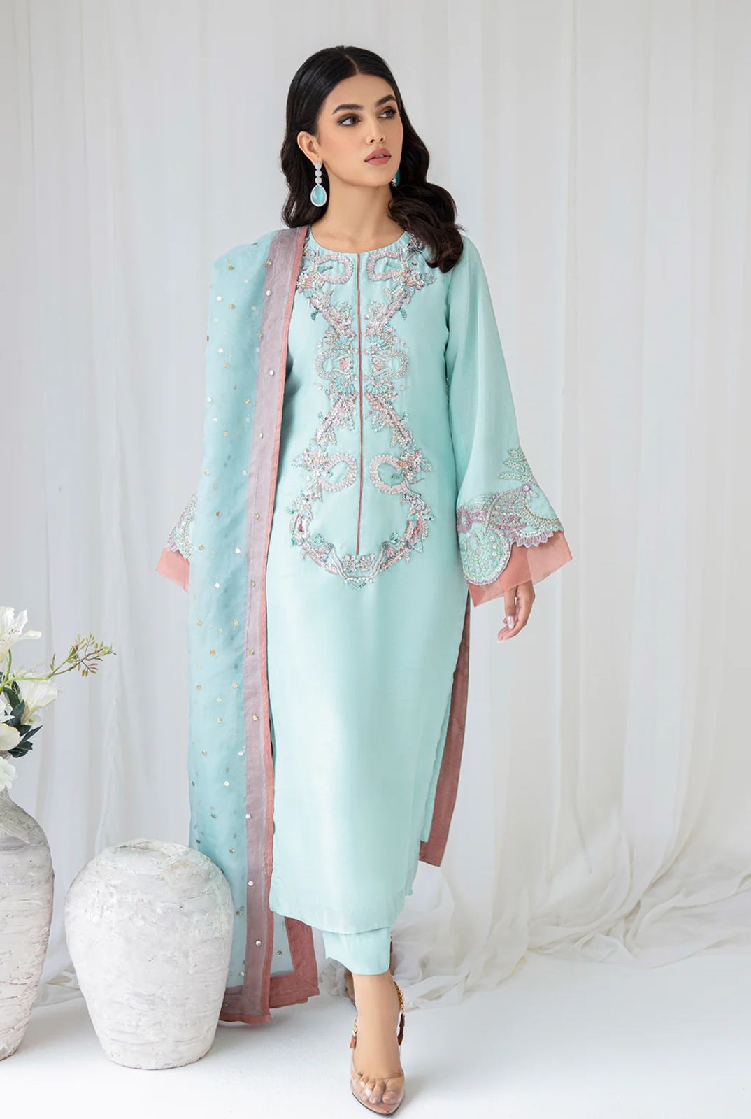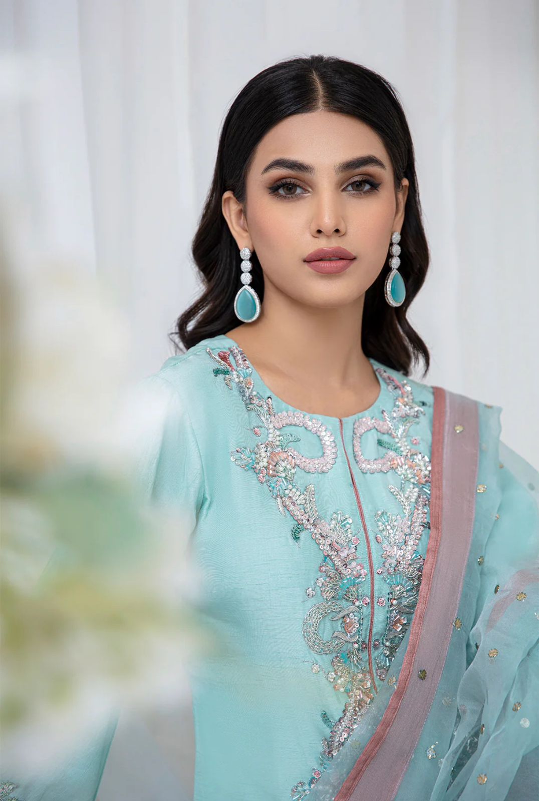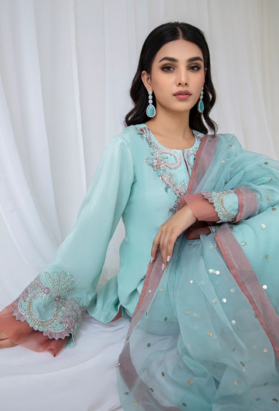 A fresh sky blue canvas is adorned with our signature embellishments of dabka, swarovskis, pearls, sequences and crystals dancing along the neckline. Sleeves are finished with tilla, sequence and resham embroideries. Paired with straight pants and organza Mukesh work dupatta.
