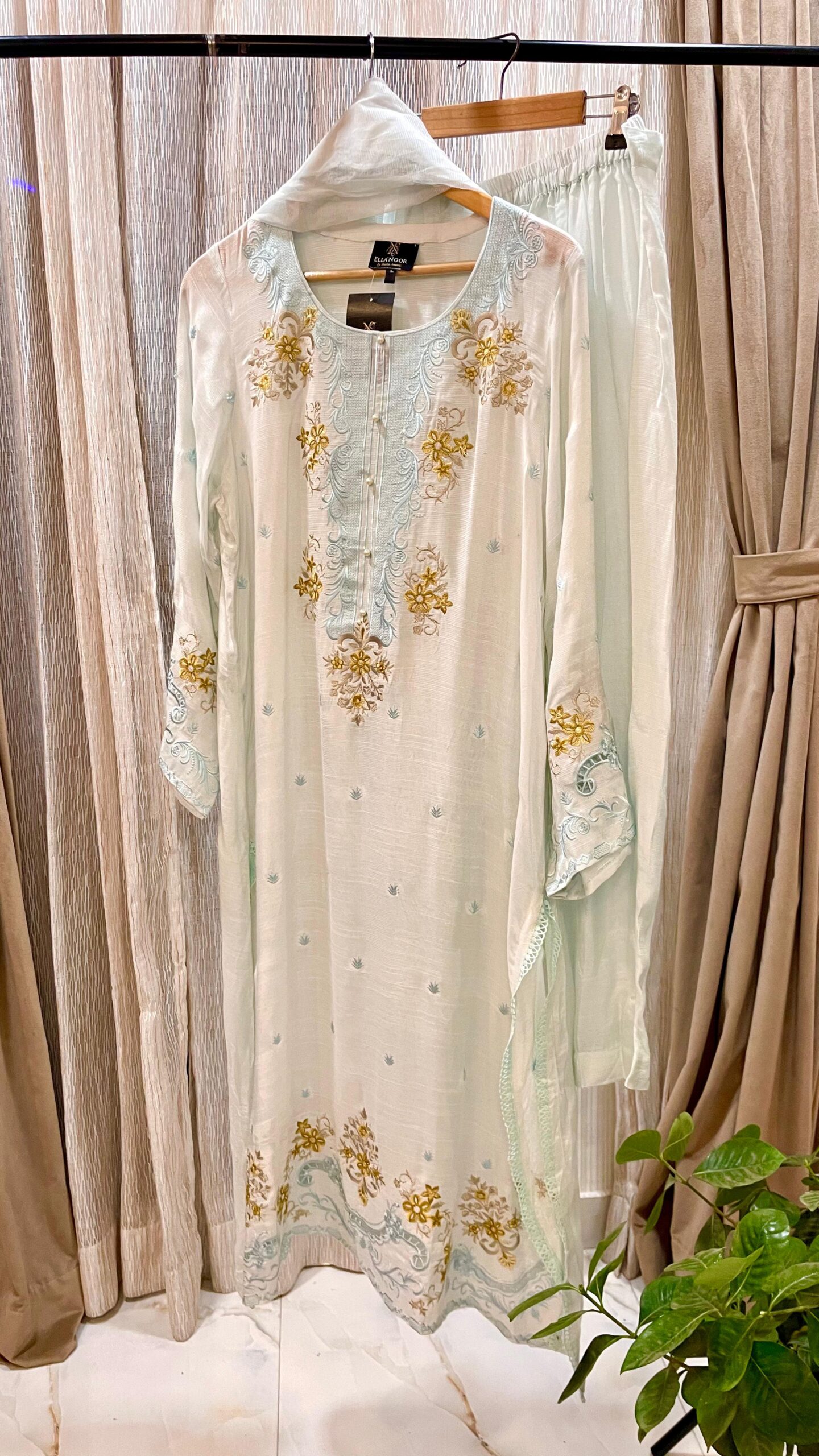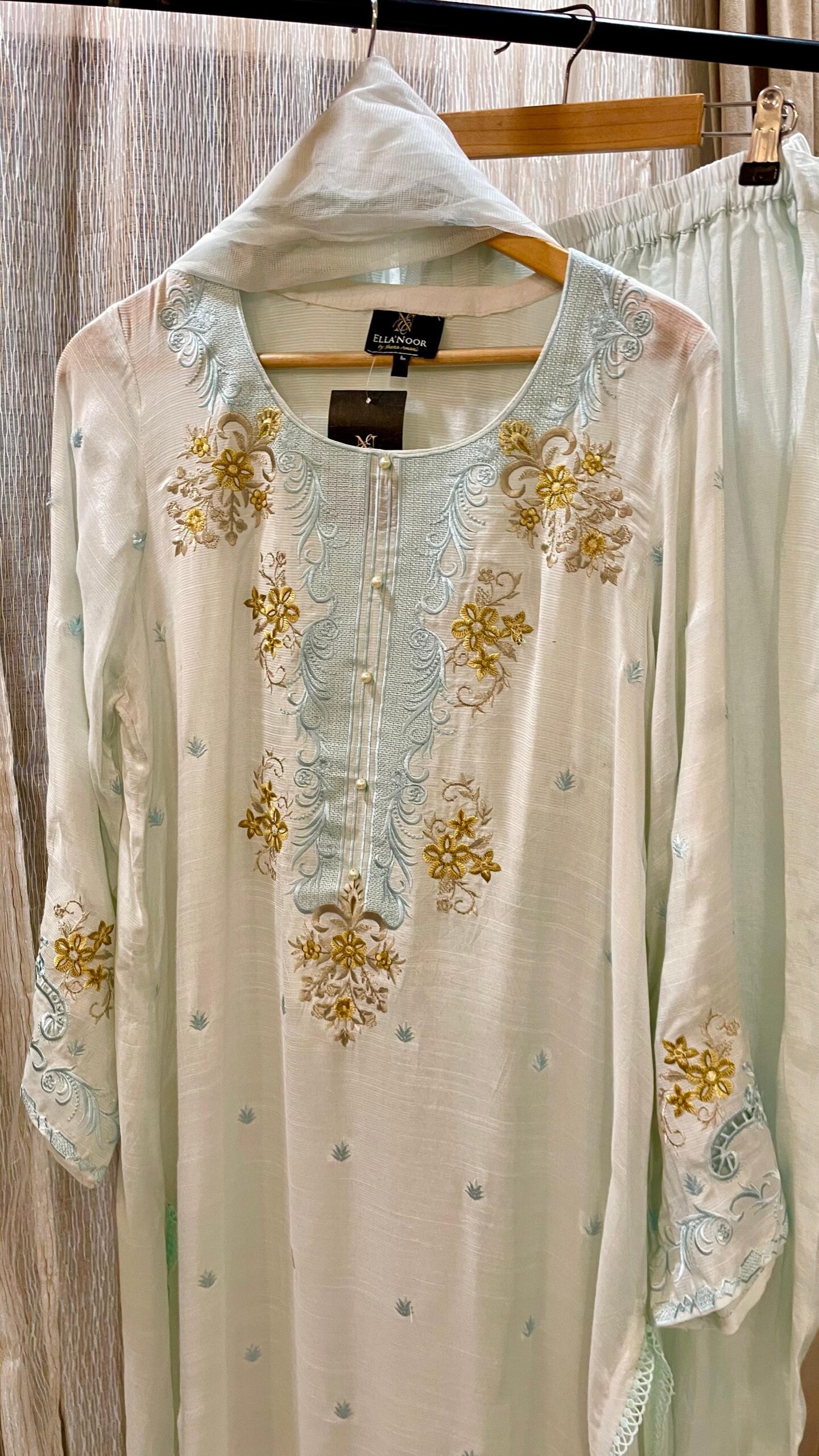 The dupatta is lightweight and airy, with fine embroidery along the borders, enhancing its graceful drape. The pants complete the ensemble with a comfortable yet elegant fit, making it a versatile choice for festive gatherings, formal occasions, or a sophisticated day out.