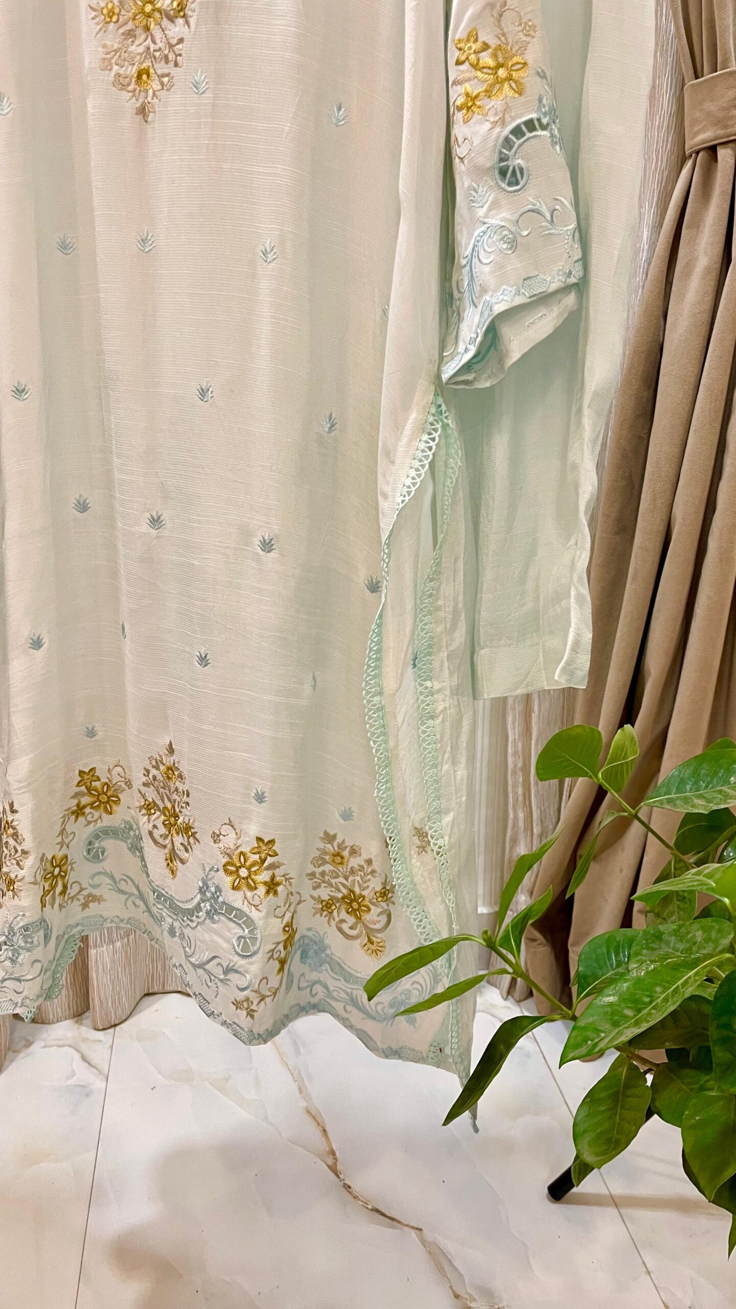 The kurta features intricate gold embroidery that shimmers subtly, complemented by self-embroidery that adds texture and depth. The design strikes the perfect balance between traditional charm and modern elegance.