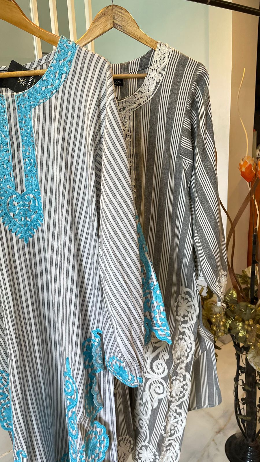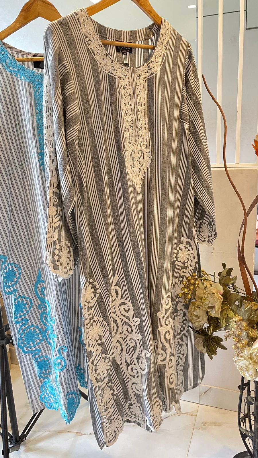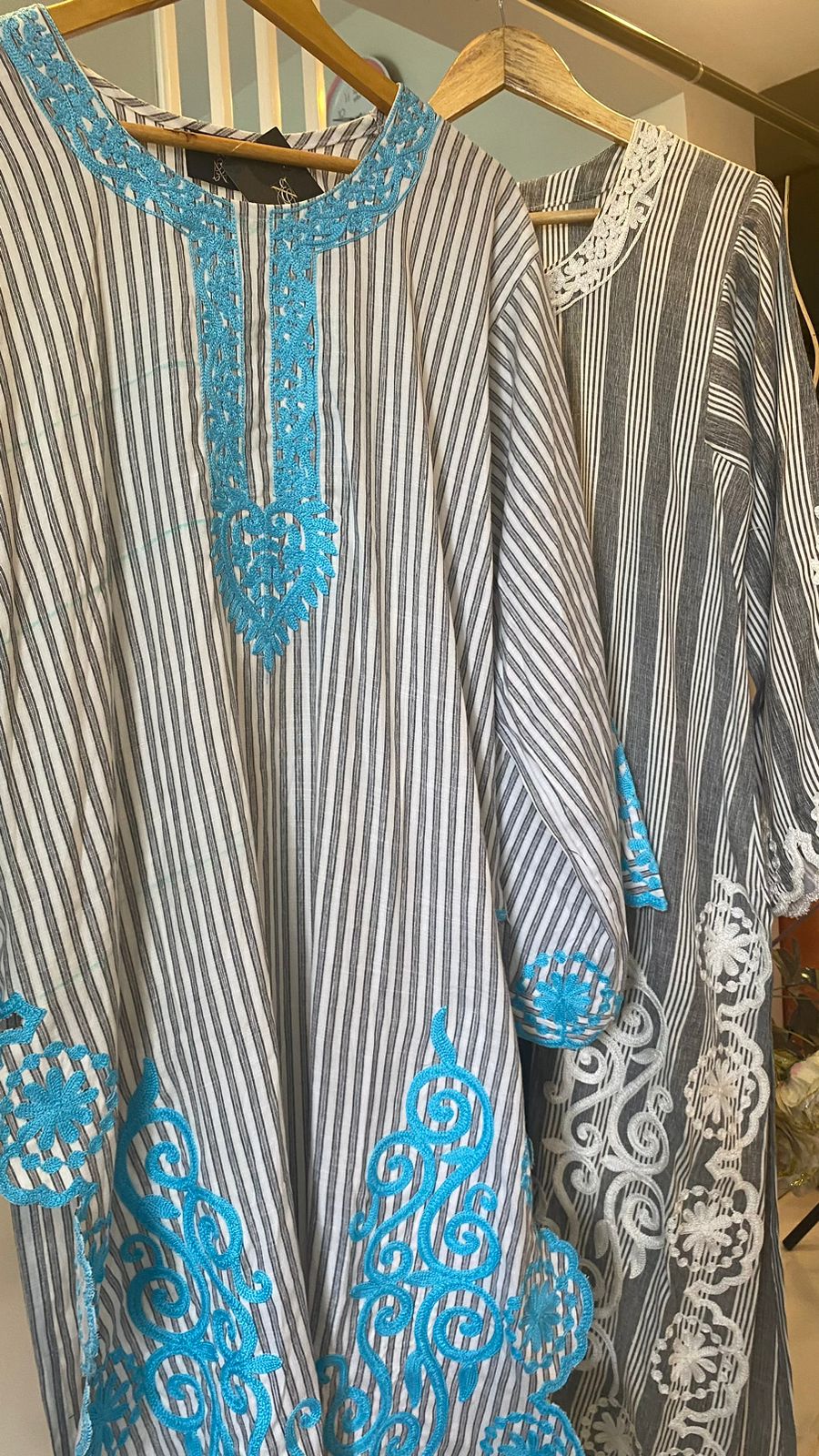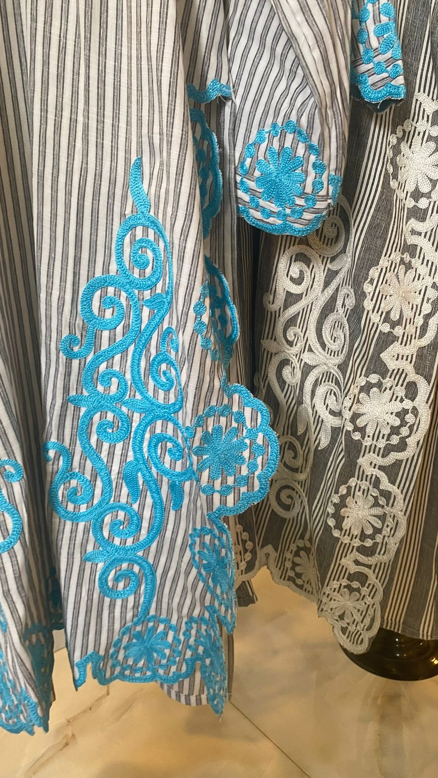 TUNIC WHICH IS LININ PRINTED WITH AARI EMBROIDERY ON NECK AND SLEEVES SIZES CAN BE COSTOMISE AS PER CLIENTS CHOICE