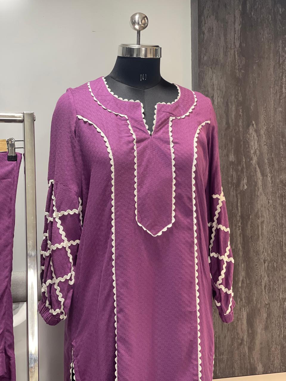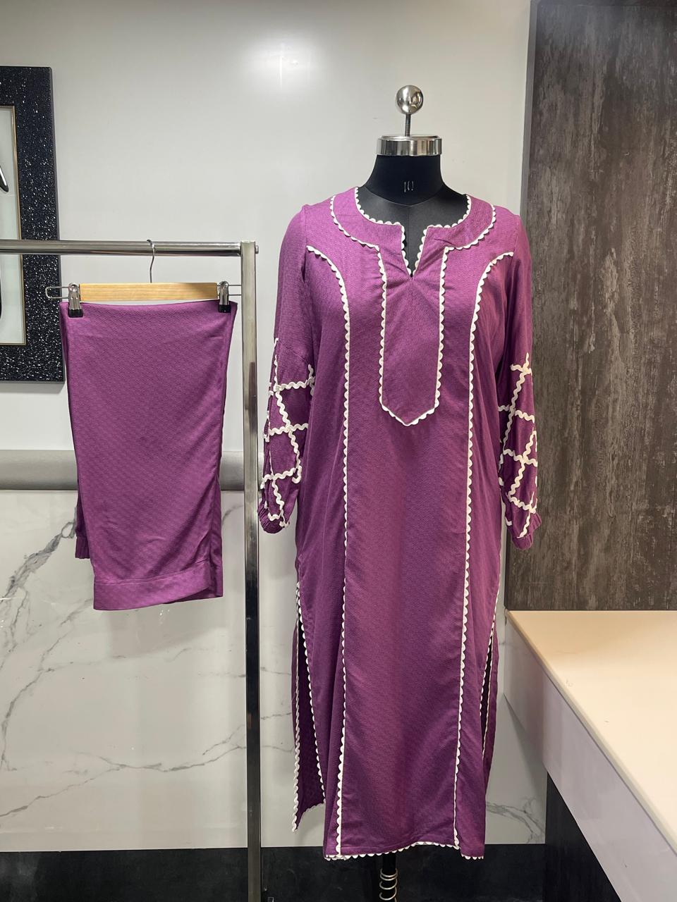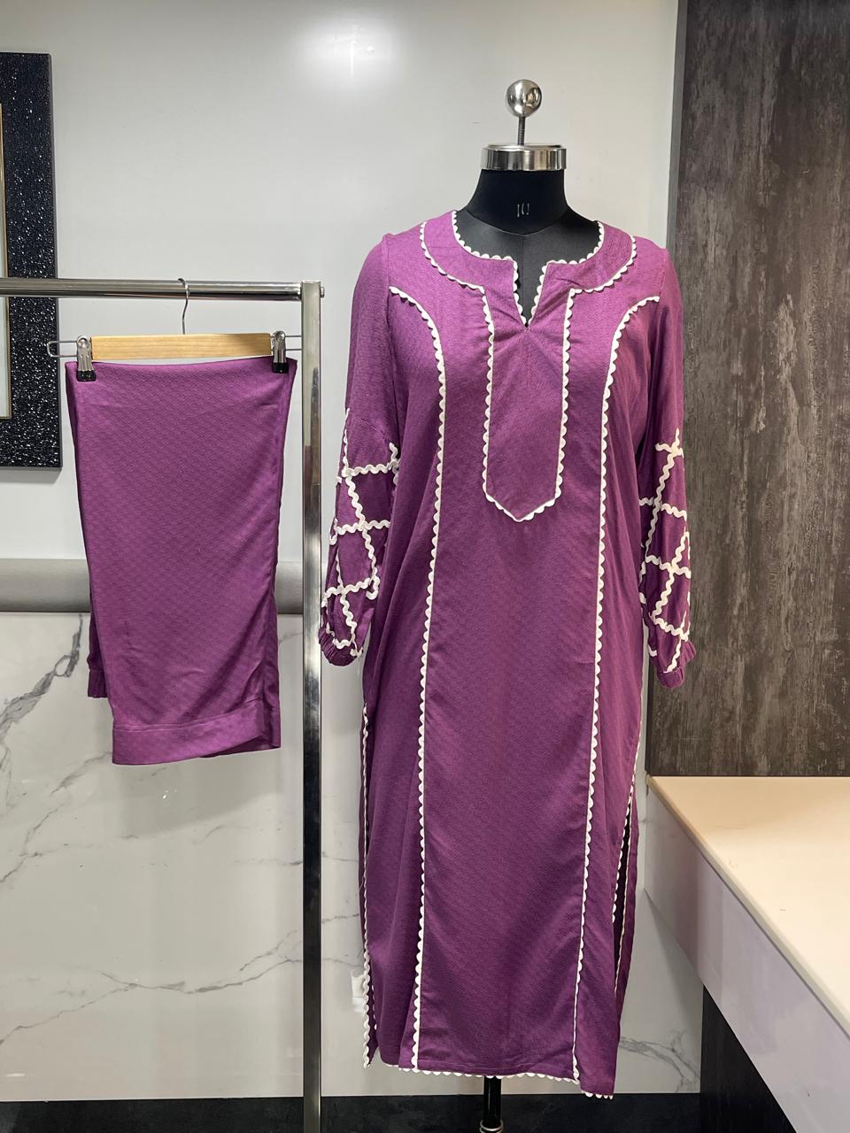 ELLA NOOR 2 PC AS YOU CAN SEE BEAUTIFUL LASE IN THE FRONT SIDE OF KURTI WITH BALLON STYLE SELLVES
