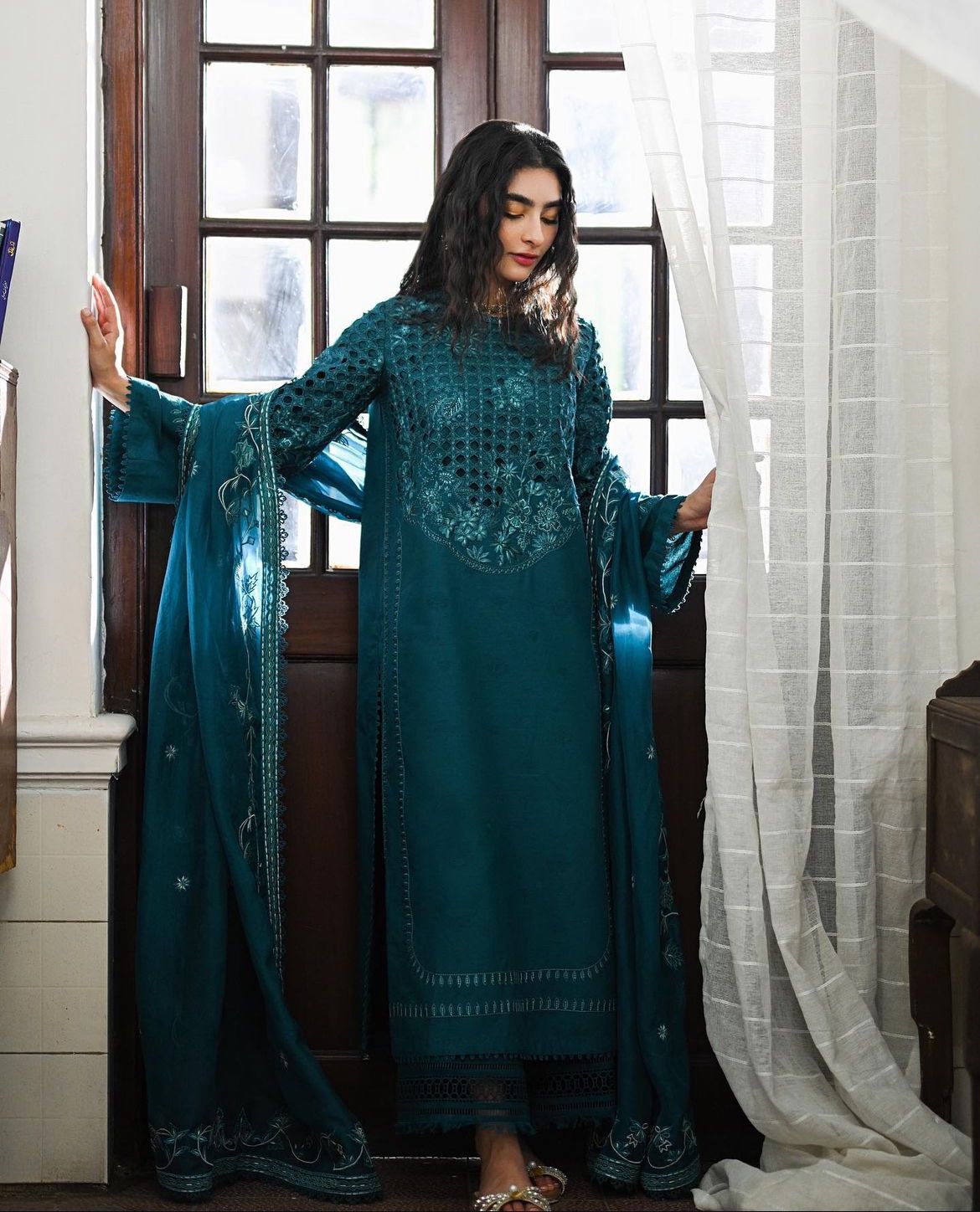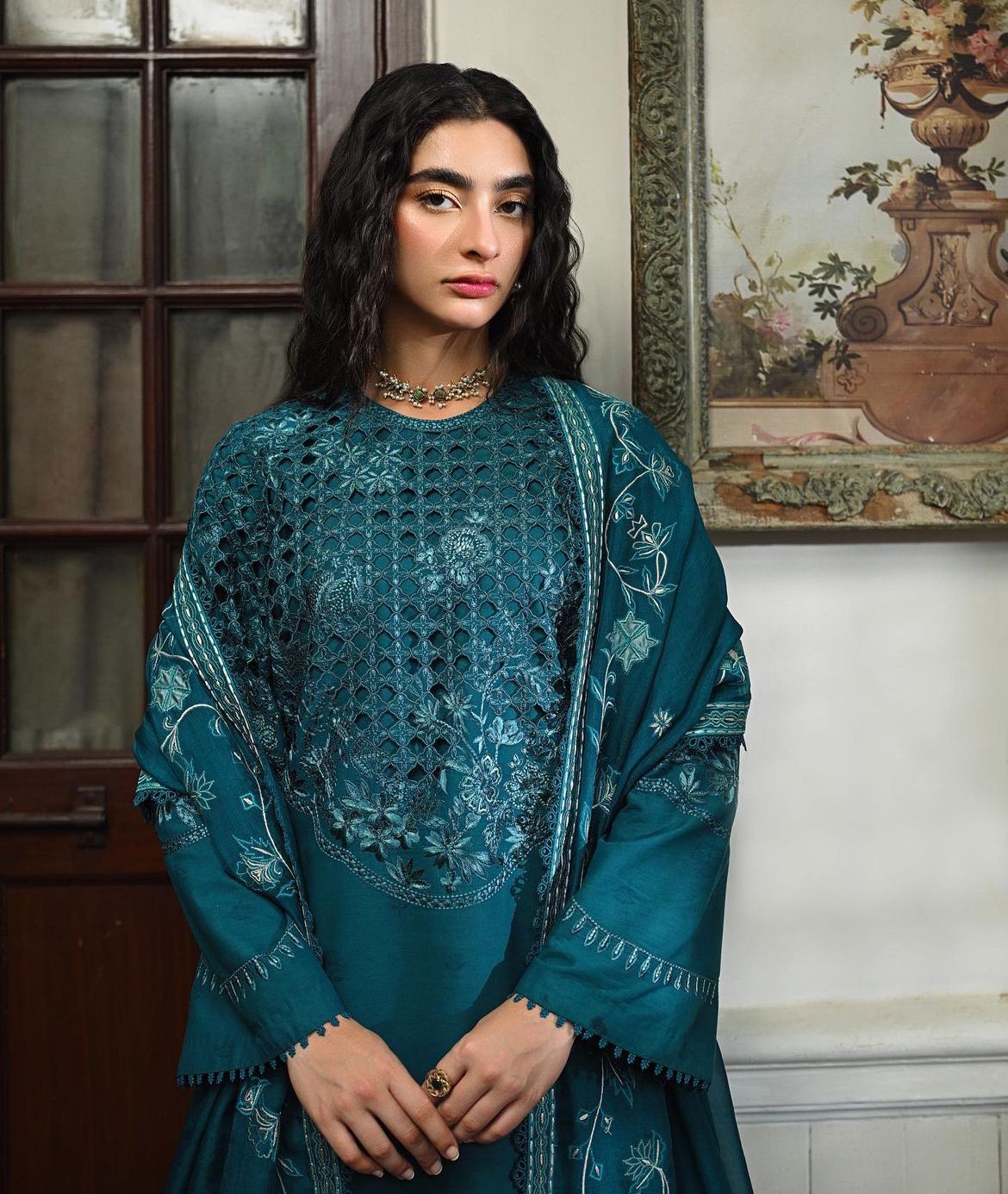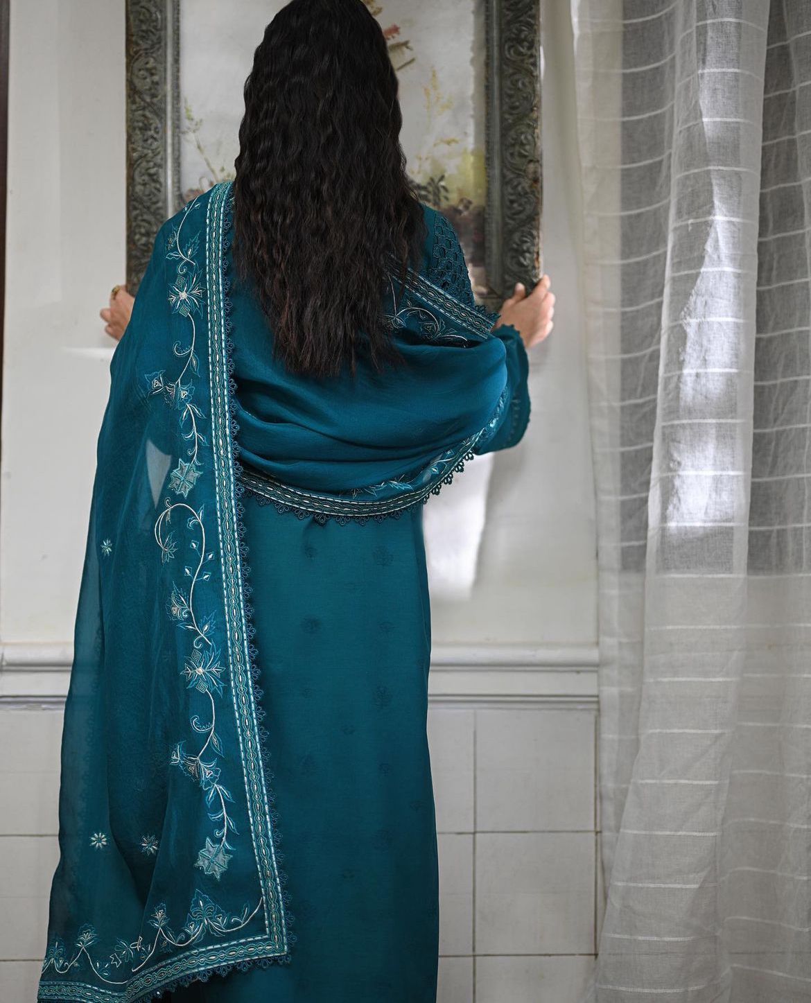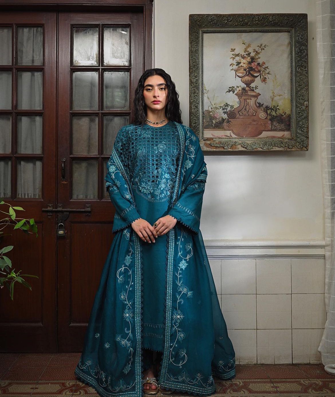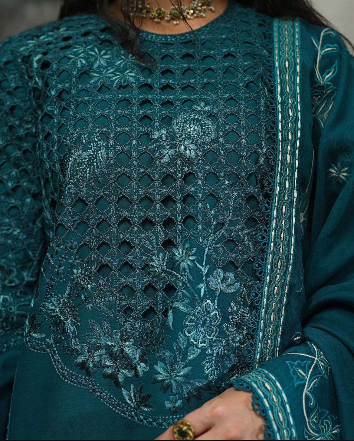Introducing our exquisite Mid night green kurta, masterfully crafted with intricate cutwork and delicate embroidery that adds a touch of timeless grace. The ensemble is complemented by a stunningly embroidered dupatta, rich with elegant details, and lacey cutwork culottes that offer a perfect blend of style and sophistication.
