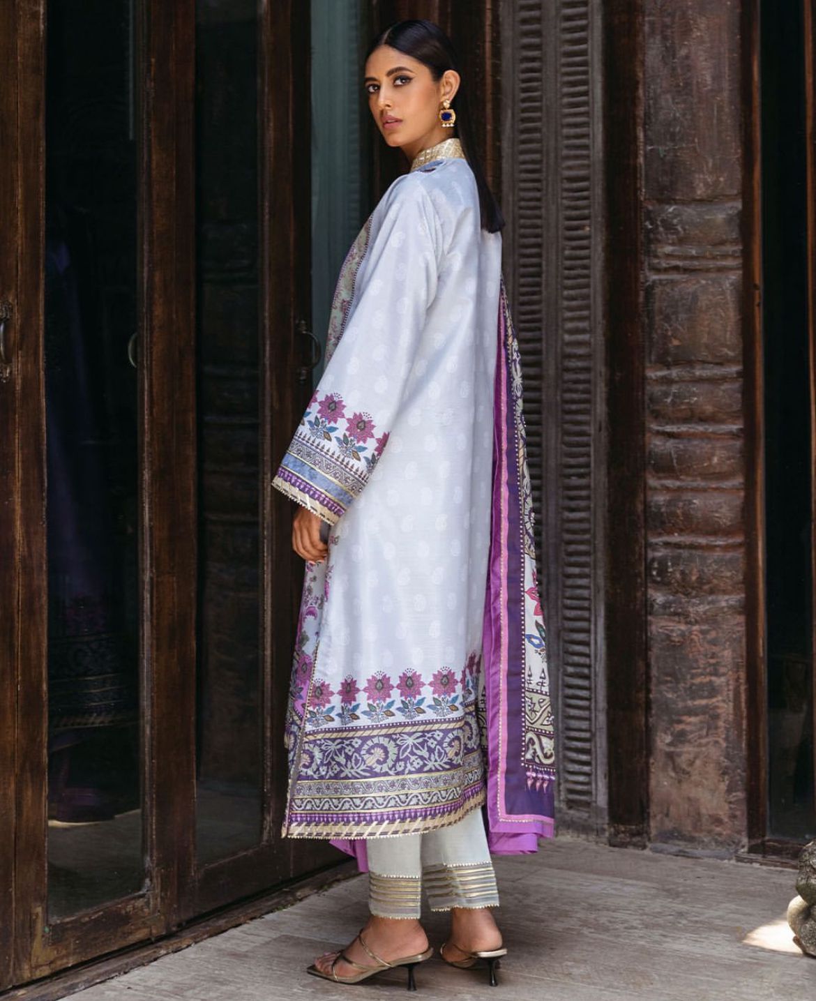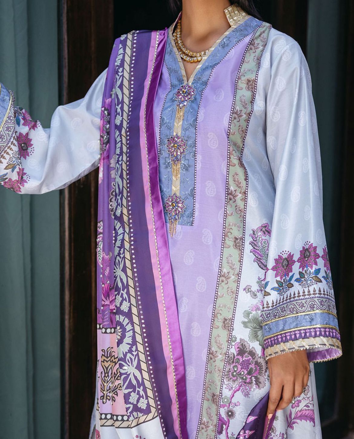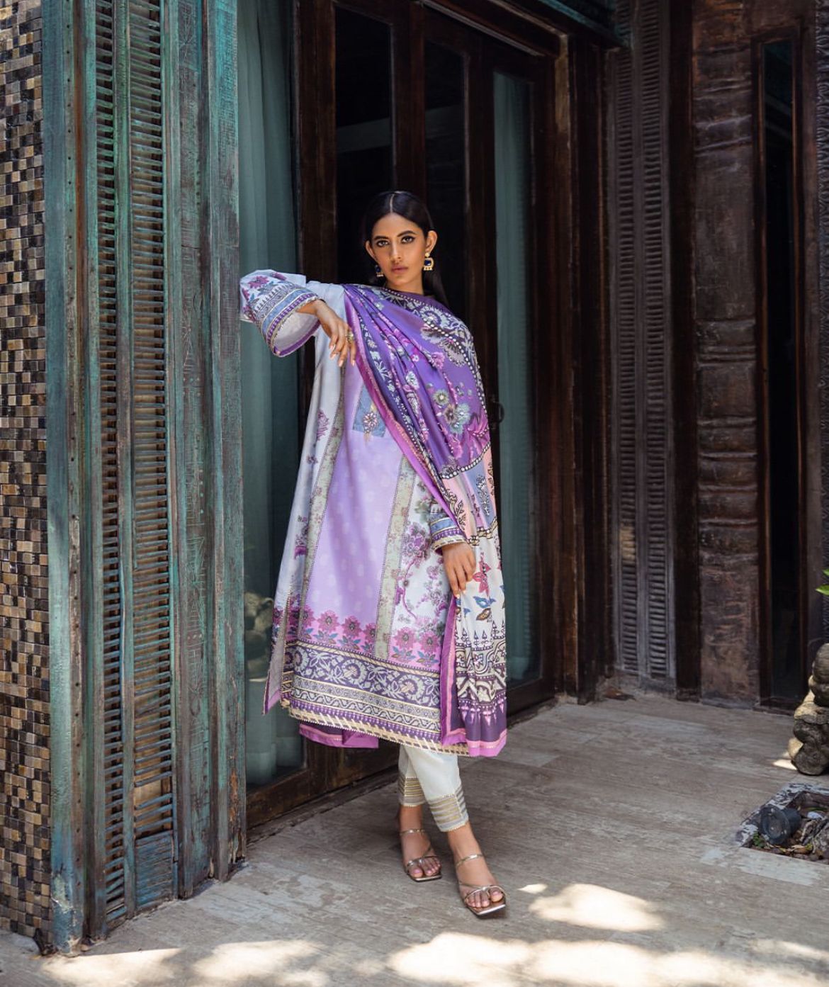 Viola from the Nirvana collection—a masterpiece crafted on luxurious raw silk with delicate embellishments that elevate its charm. The vibrant printed design adds a touch of modern elegance, while the flowing silk dupatta completes the ensemble with effortless grace. Viola is the perfect blend of tradition and sophistication, designed for those who appreciate timeless beauty.