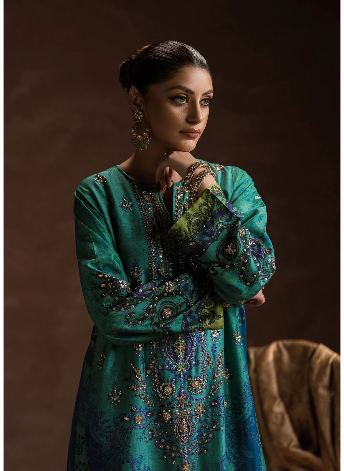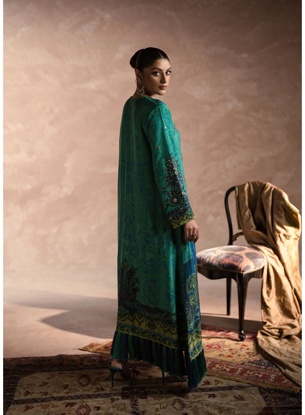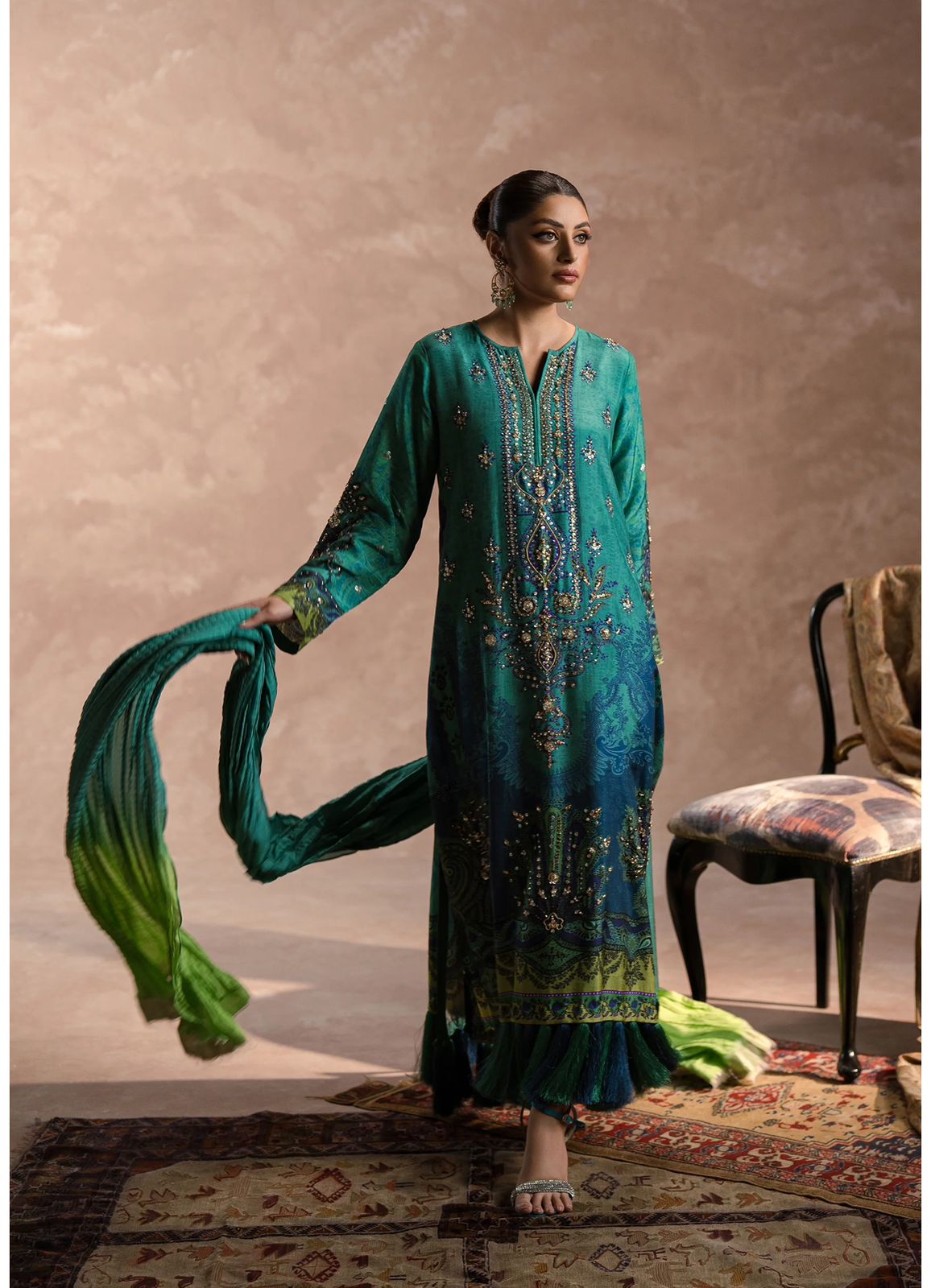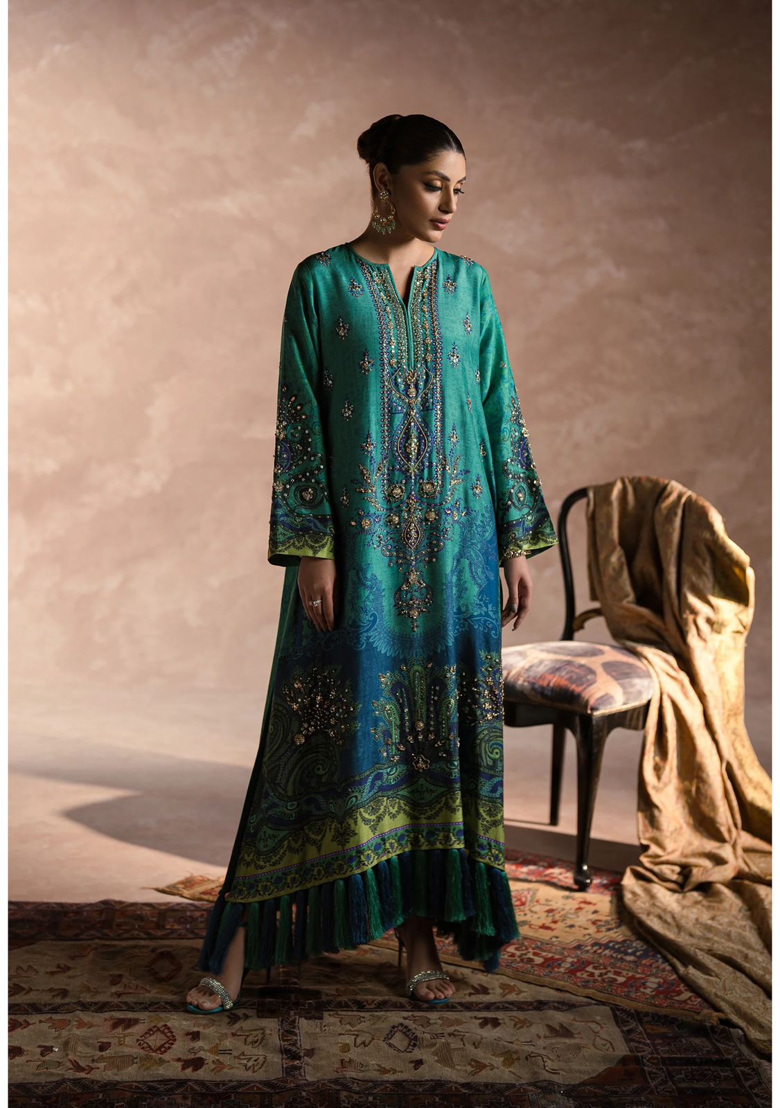 Ethnic meets contemporary cool via this beautiful design inspired by peacock colours. Multi-coloured tassels add fun and flair to this beautiful design fully hand embellished using fine sequins, crystals and bead-work. It comes with straight pants. a perfect choice for a mehndi or sangeet or any wedding festivities in the season ahead. (A dupatta can be added separately, if required, to complete the look)