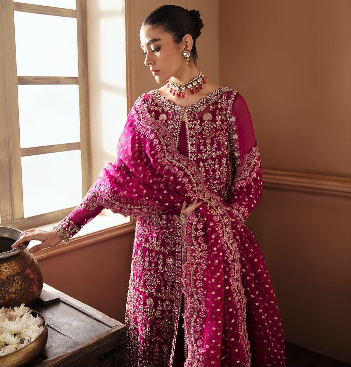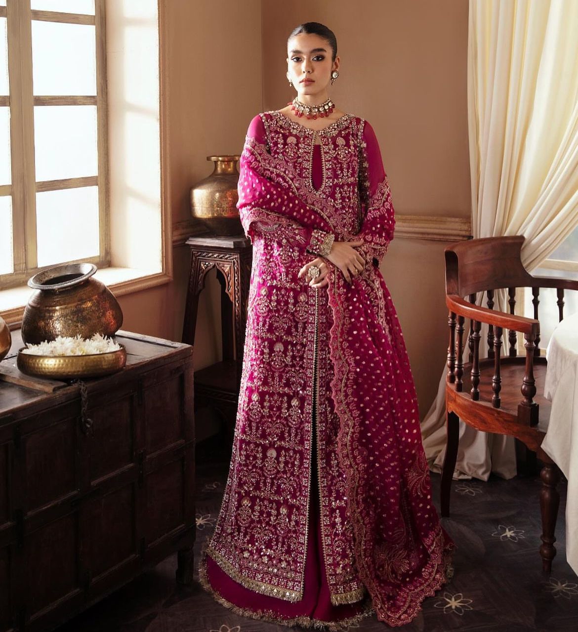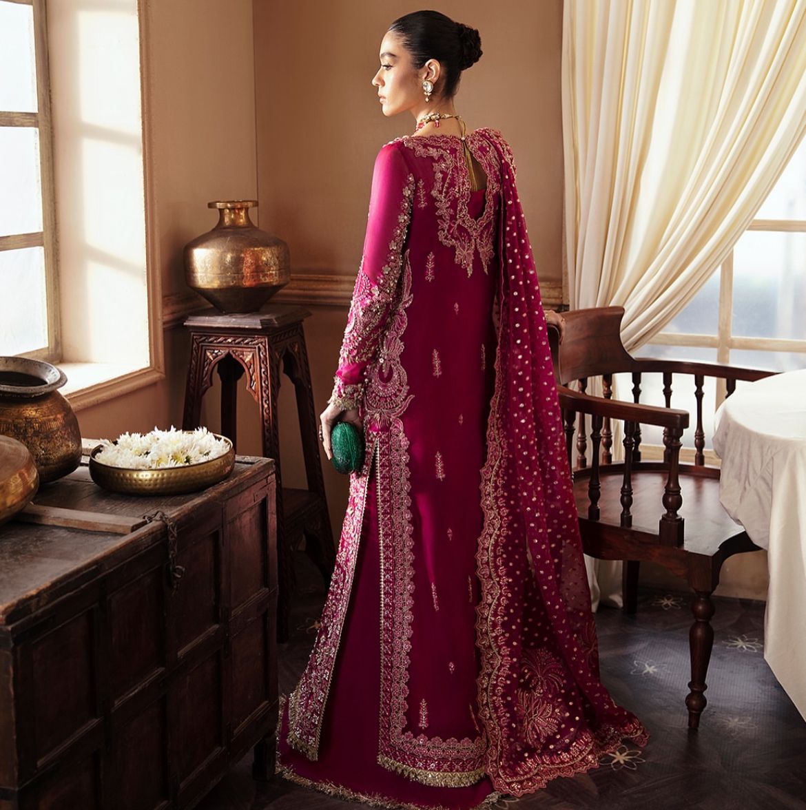Emerges as a beacon of elegance, donning a Ravishing Dark Fuchsia gown in Organza, meticulously paired with Raw Silk, Sharara, reflects the masterpiece of hand crafted artistry. A divine touch is introduced through a delicate and rich Zari Oraganza Dupatta with motifs on the corner and sequence spray dance in jubilant harmony. Raizel’s presence will make you the center of attention, worthy of admir   ation and awe.