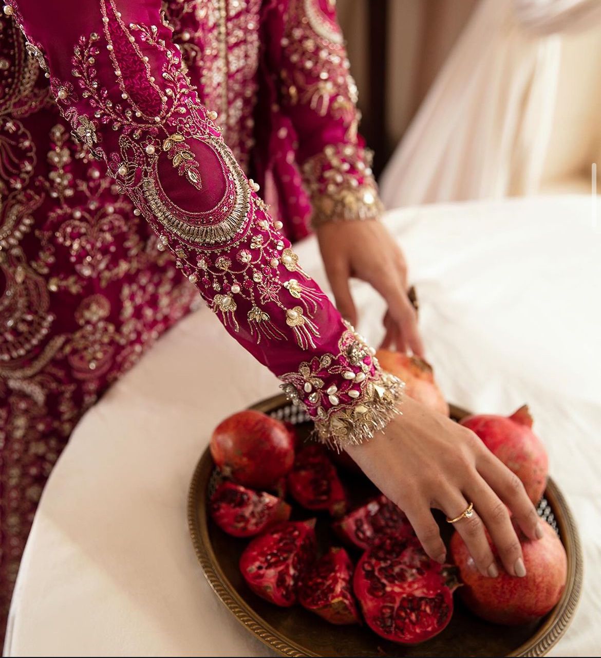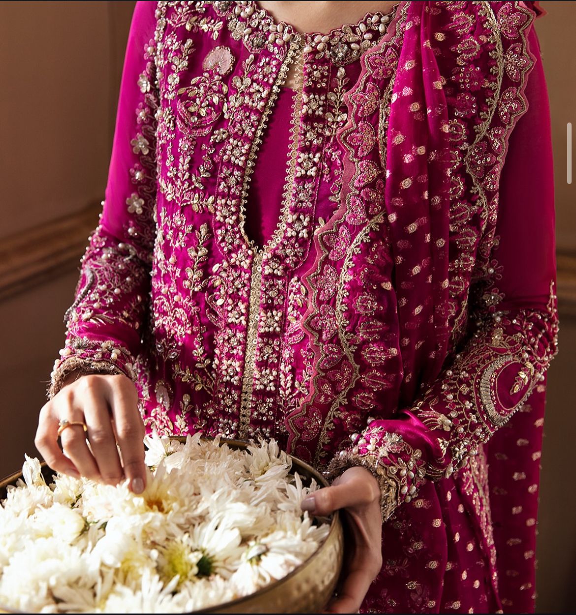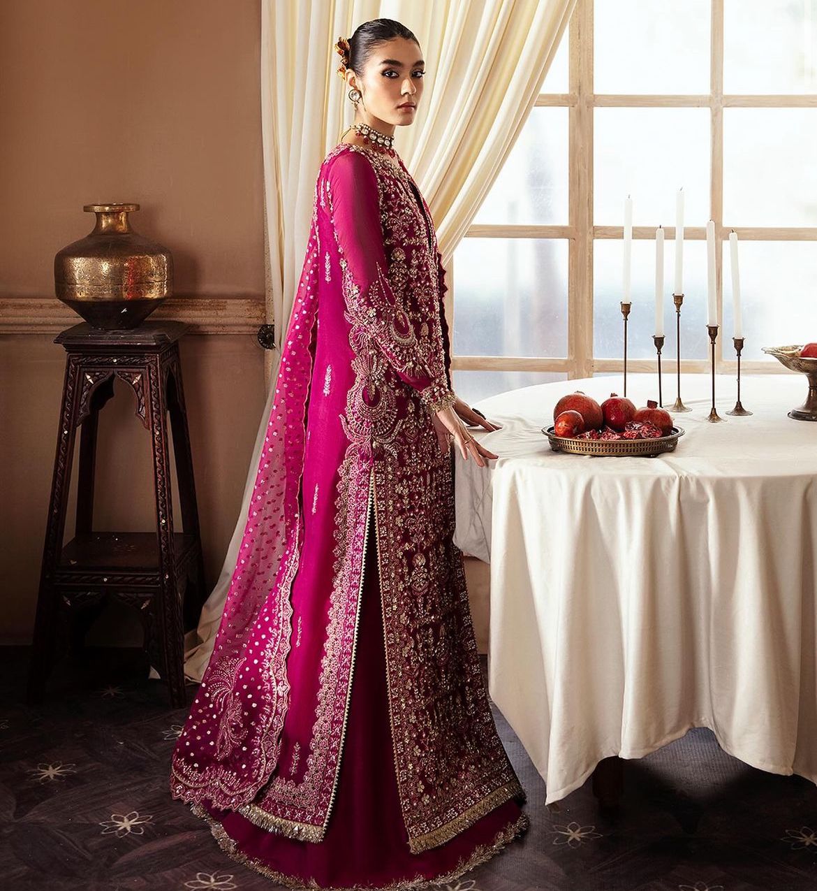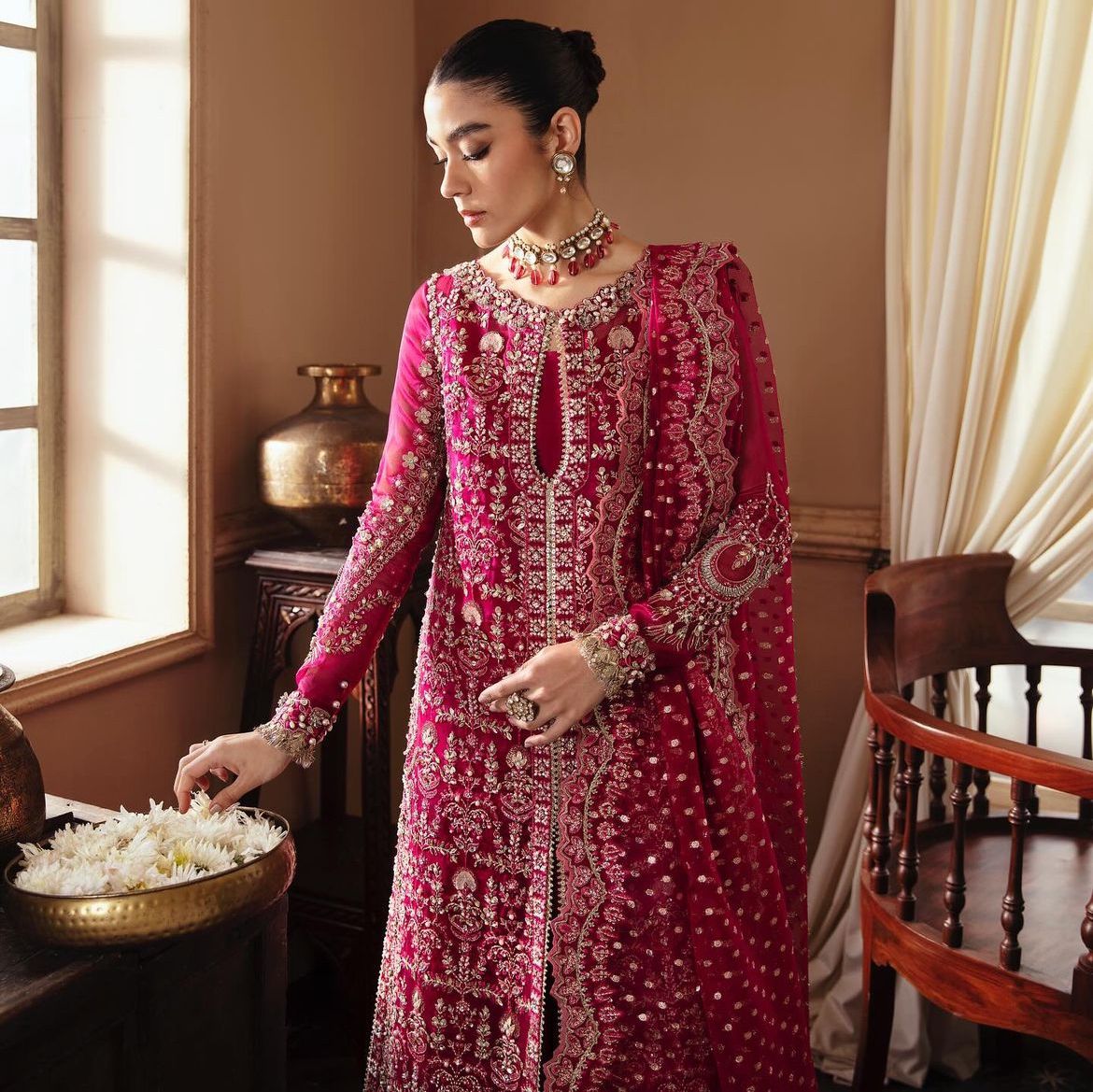 Emerges as a beacon of elegance, donning a Ravishing Dark Fuchsia gown in Organza, meticulously paired with Raw Silk, Sharara, reflects the masterpiece of hand crafted artistry. A divine touch is introduced through a delicate and rich Zari Oraganza Dupatta with motifs on the corner and sequence spray dance in jubilant harmony. Raizel’s presence will make you the center of attention, worthy of admir   ation and awe.