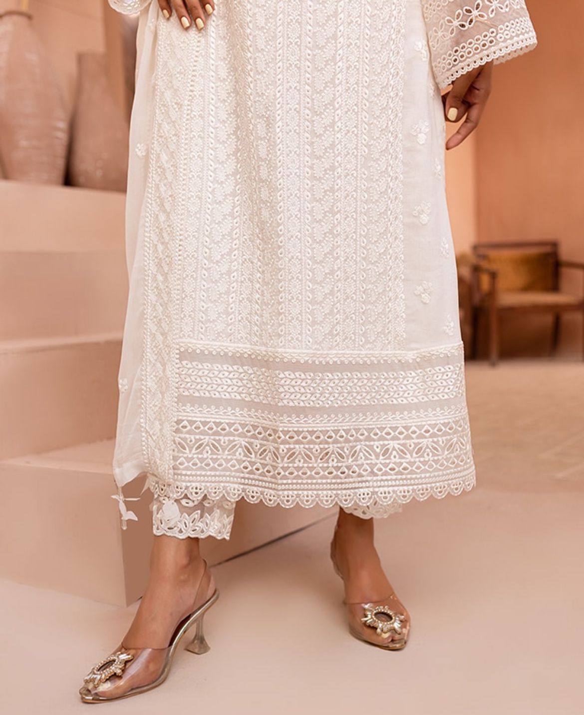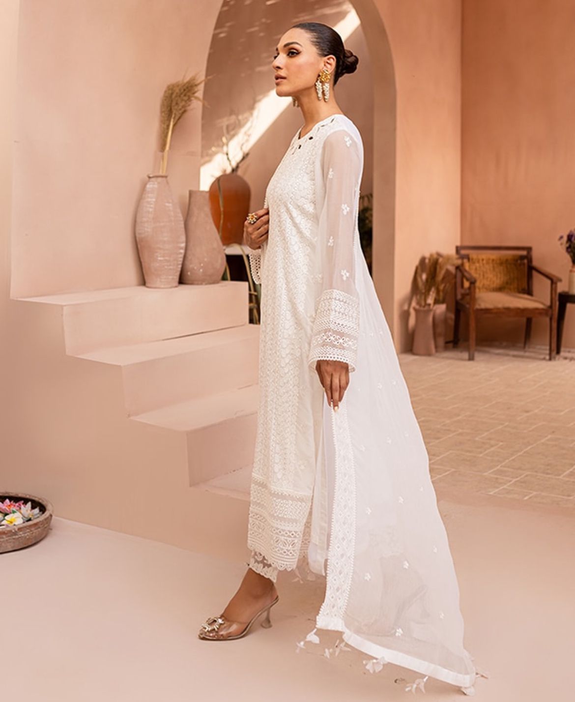 Introducing Royal Allure – a stunning embroidered chiffon ensemble that exudes elegance and sophistication. The sequin embellishments on the front and sleeves add a touch of sparkle, while the dyed chiffon back and embroidered organza borders complete the look. With a shirt length of 48” and inner fabric included. It is paired with raw silk bottoms and a beautifully enhanced chiffon dupatta.