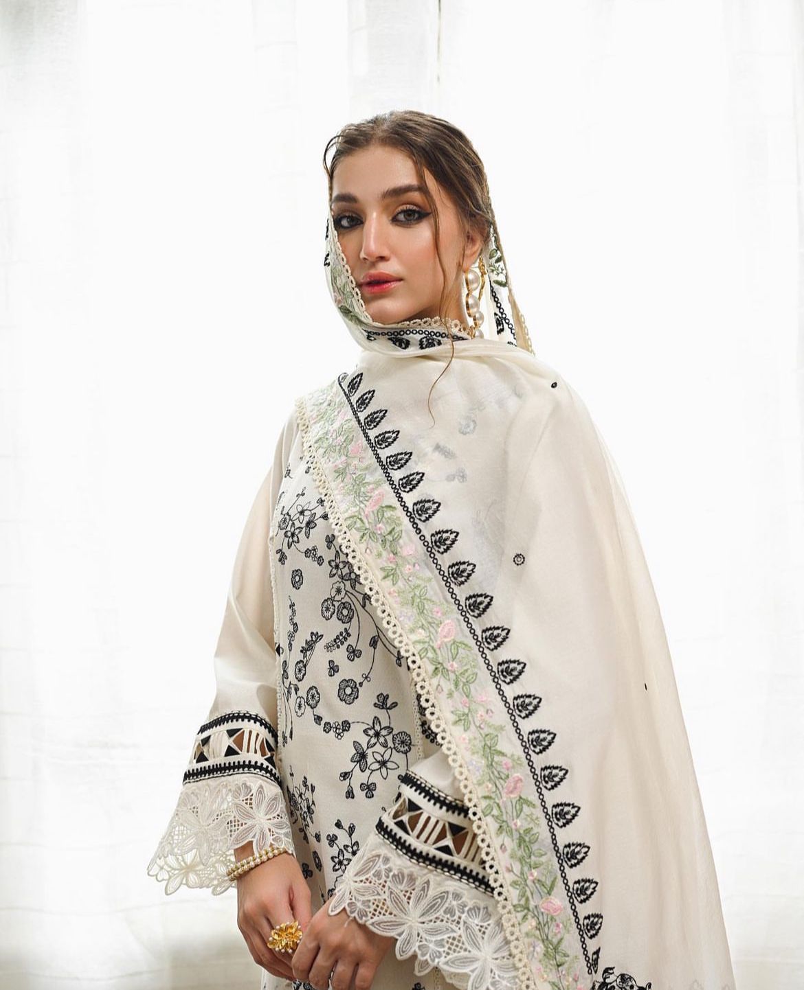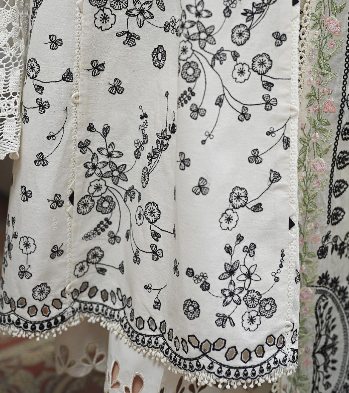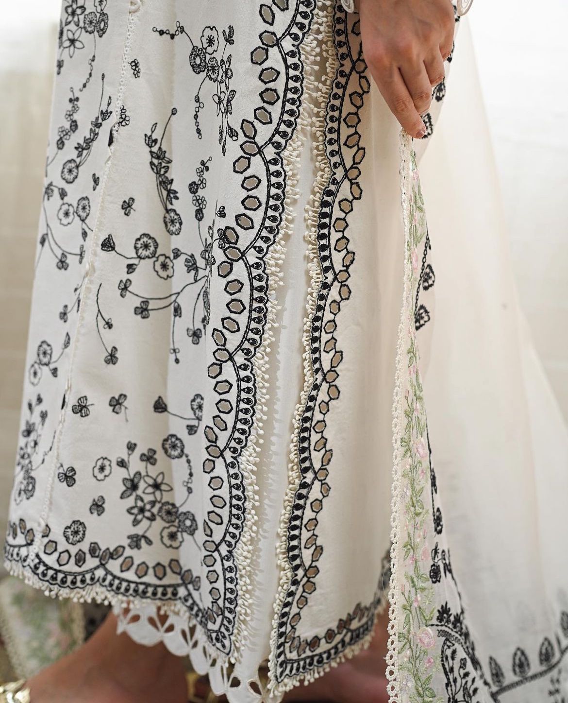 Embrace elegance with our off-white kurta, exquisitely crafted with intricate black embroidery, The delicate patterns create a striking contrast, making this piece truly captivating. Paired with a beautifully embroidered dupatta and meticulously designed cutwork culottes, this ensemble is a masterpiece of tradition and modernity, perfect for making a sophisticated statement.
