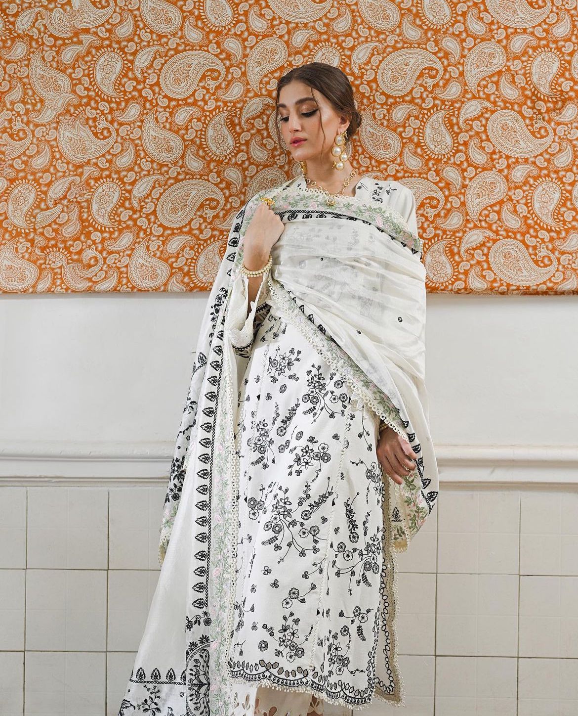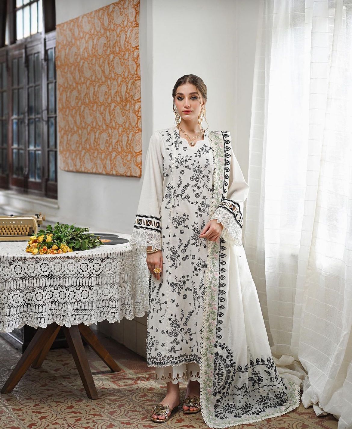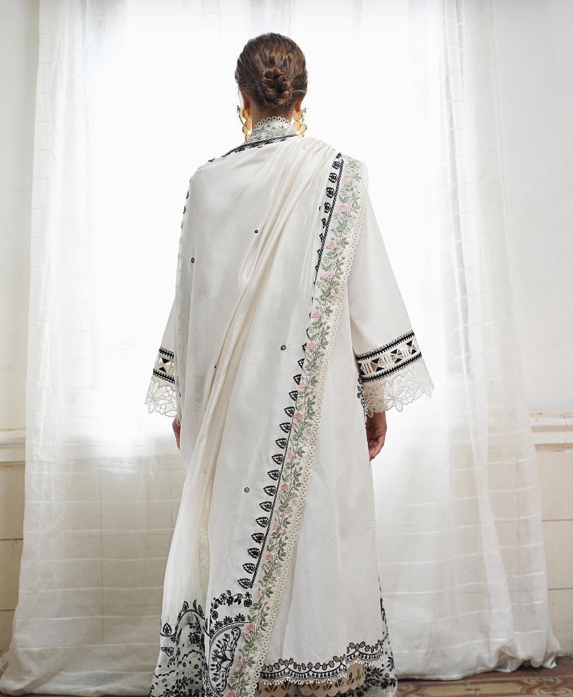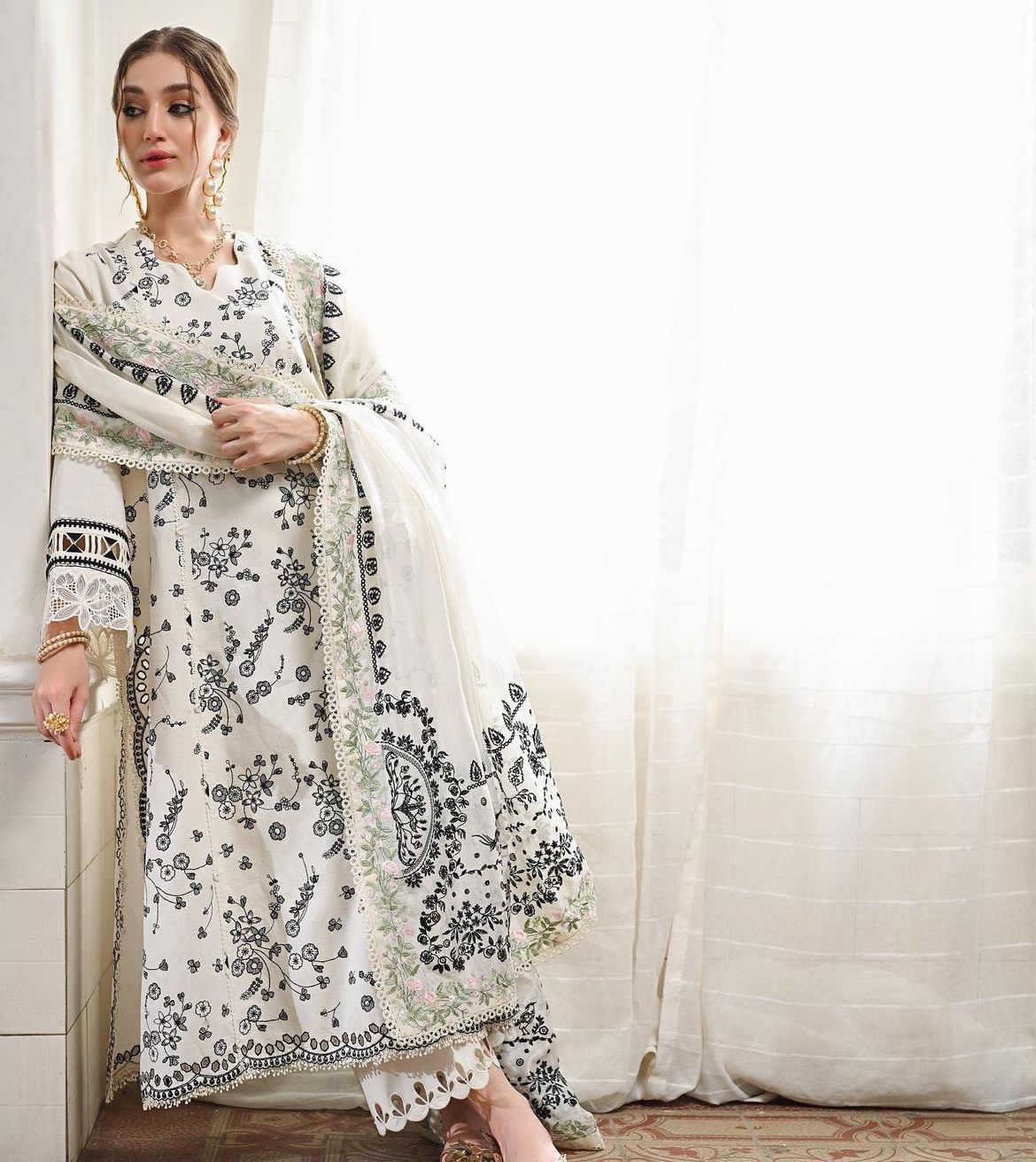 Embrace elegance with our off-white kurta, exquisitely crafted with intricate black embroidery, The delicate patterns create a striking contrast, making this piece truly captivating. Paired with a beautifully embroidered dupatta and meticulously designed cutwork culottes, this ensemble is a masterpiece of tradition and modernity, perfect for making a sophisticated statement.