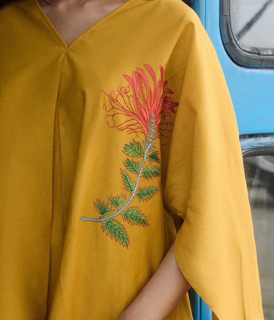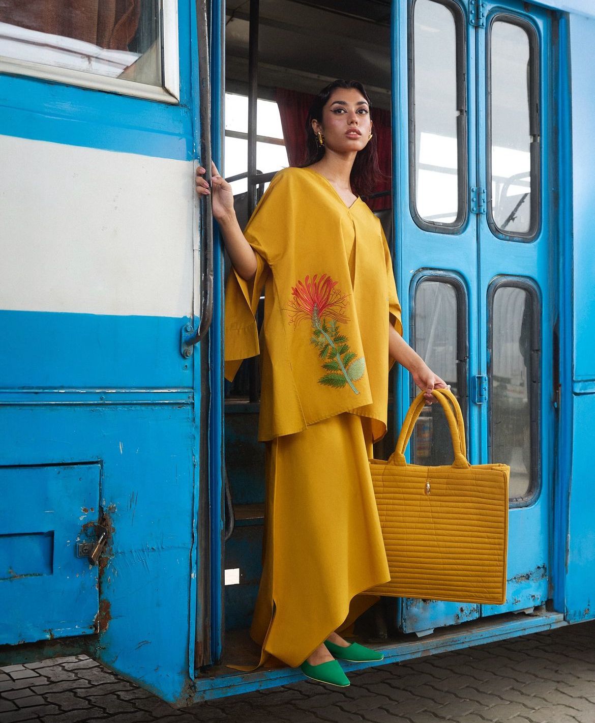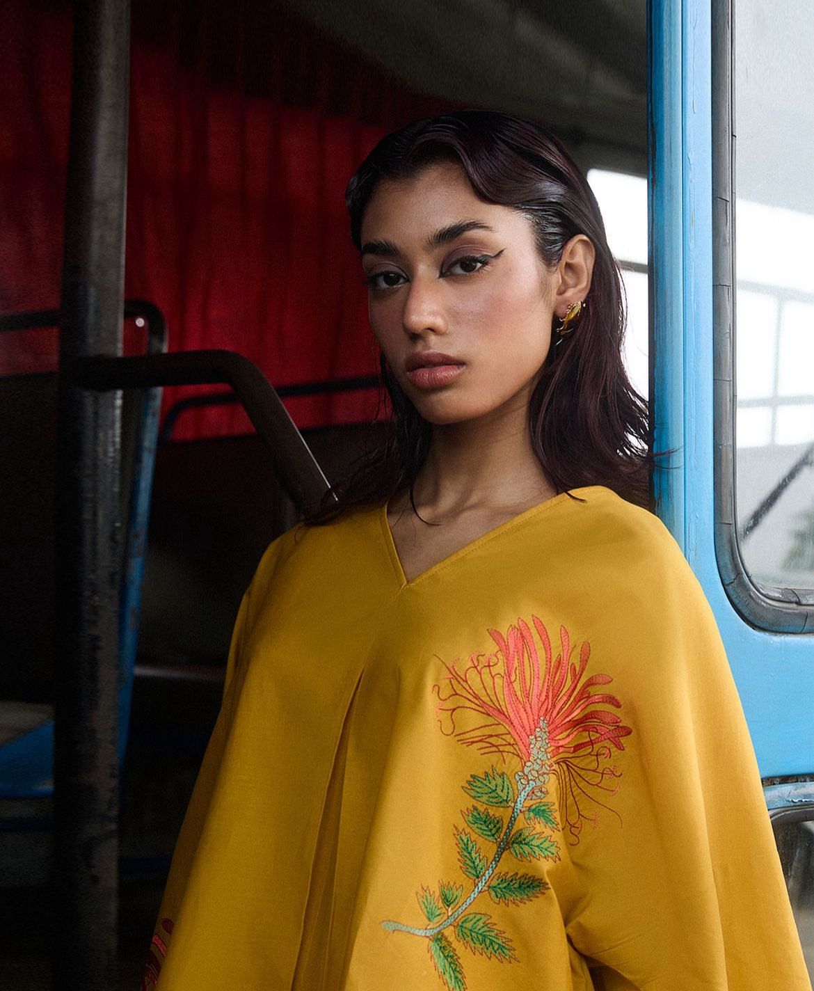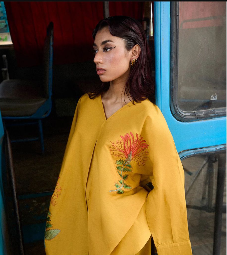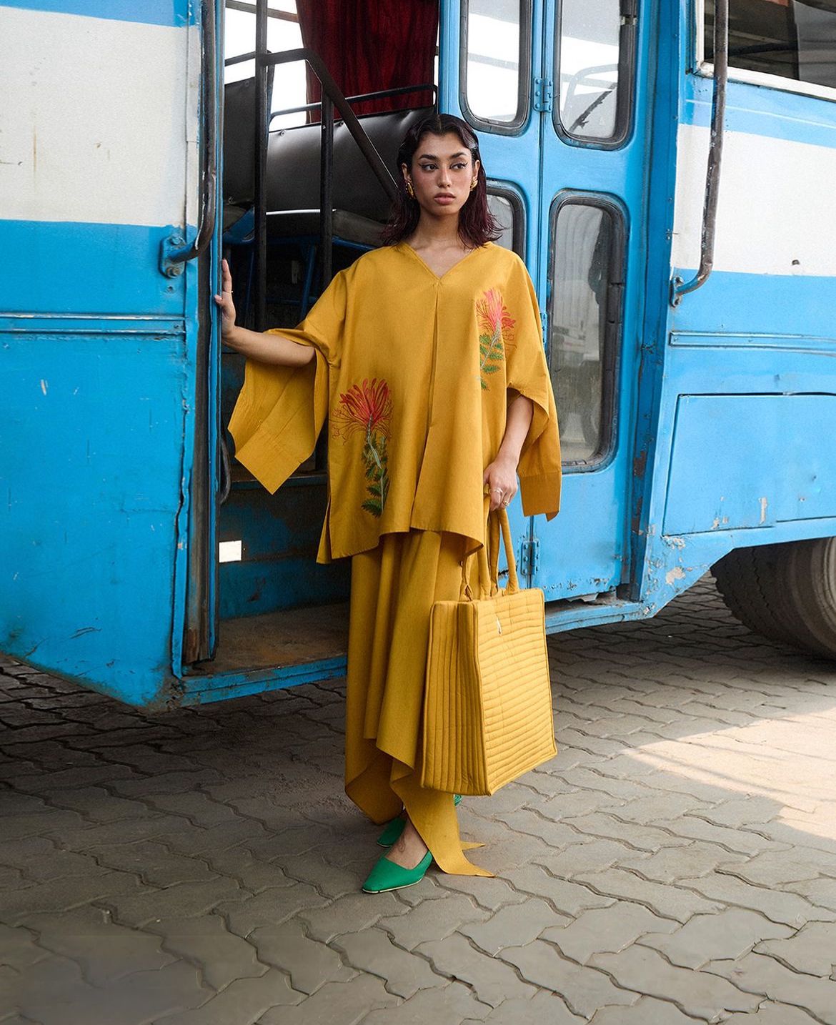 Illuminate your wardrobe with this striking mustard ensemble, featuring a chic A-line shirt and matching skirt. The shirt boasts a bold inverted box pleat at the center, adding a touch of architectural interest to its elegant design. High slit sleeves with broad cuffs enhance the shirt’s sophisticated silhouette, while exquisite exotic flower embroidery brings a hint of artistic flair. The outfit is completed with a mustard A-line skirt, which flows gracefully with cascading fabric panels on the sides, creating a dynamic and fluid movement. This combination of rich color and intricate details results in a look that is both captivating and refined, perfect for making a memorable impression.
